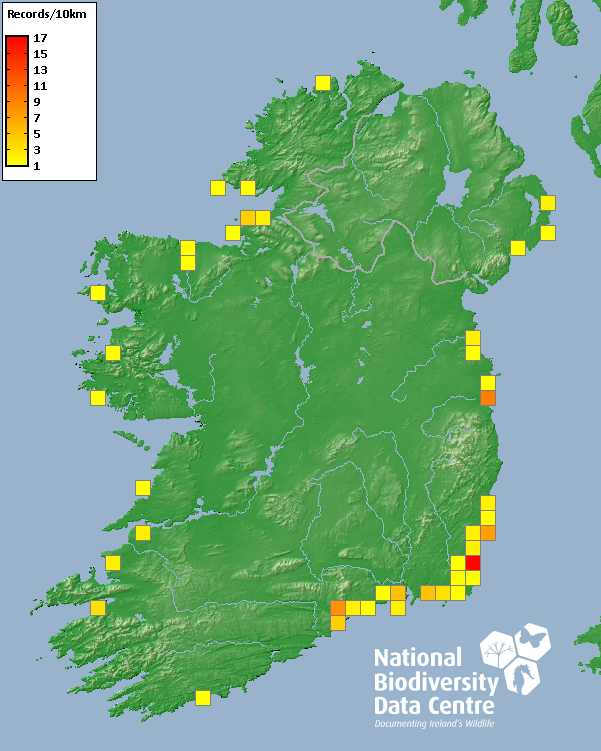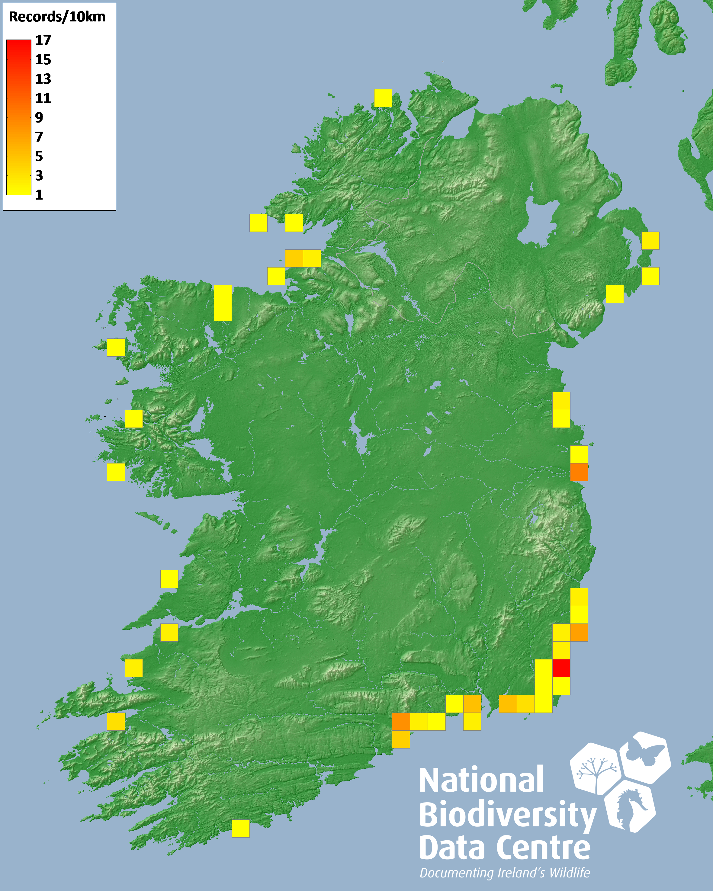 Distribution of the number of records recorded within each 10km grid square (ITM).Marine Map - 50km