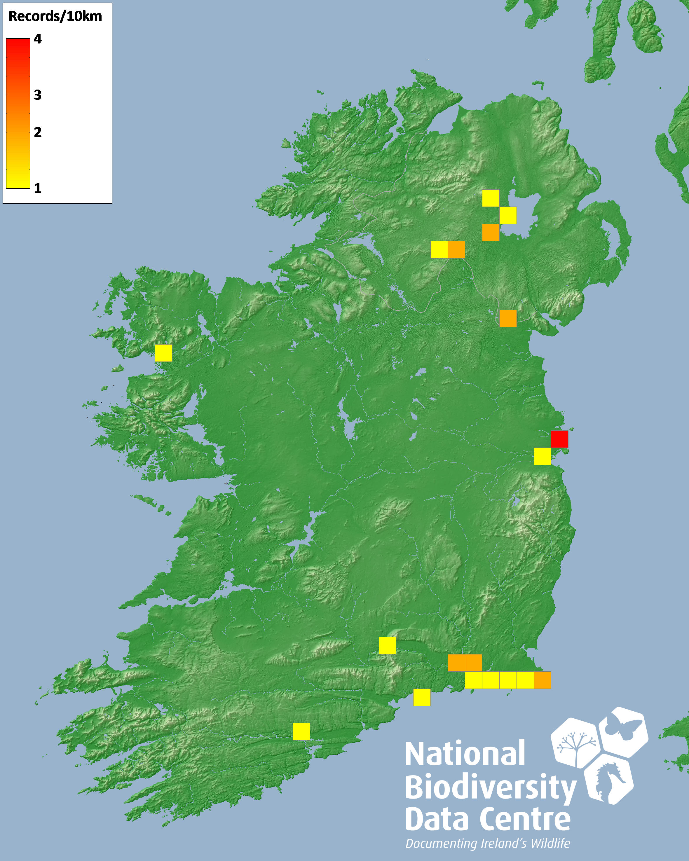Distribution of the number of records recorded within each 10km grid square (ITM).Marine Map - 50km