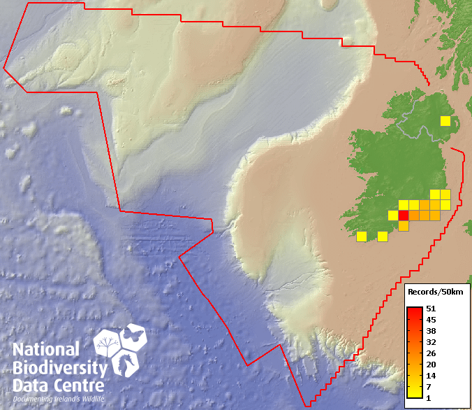Distribution of the number of records recorded within each 10km grid square (ITM).Marine Map - 50km
