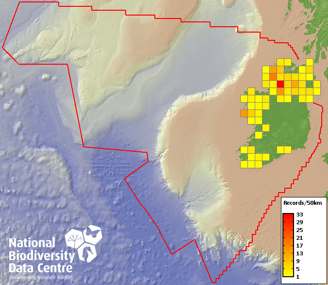 Distribution of the number of records recorded within each 10km grid square (ITM).Marine Map - 50km