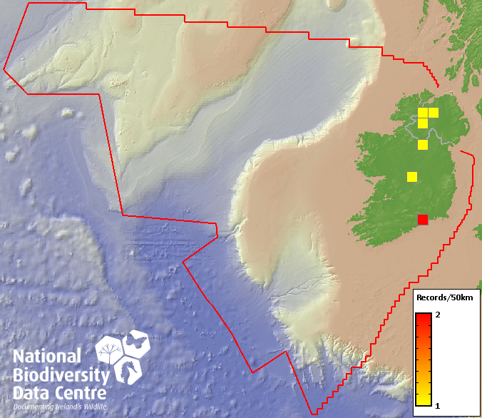 Distribution of the number of records recorded within each 10km grid square (ITM).Marine Map - 50km
