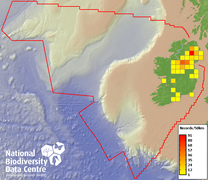Distribution of the number of records recorded within each 10km grid square (ITM).Marine Map - 50km