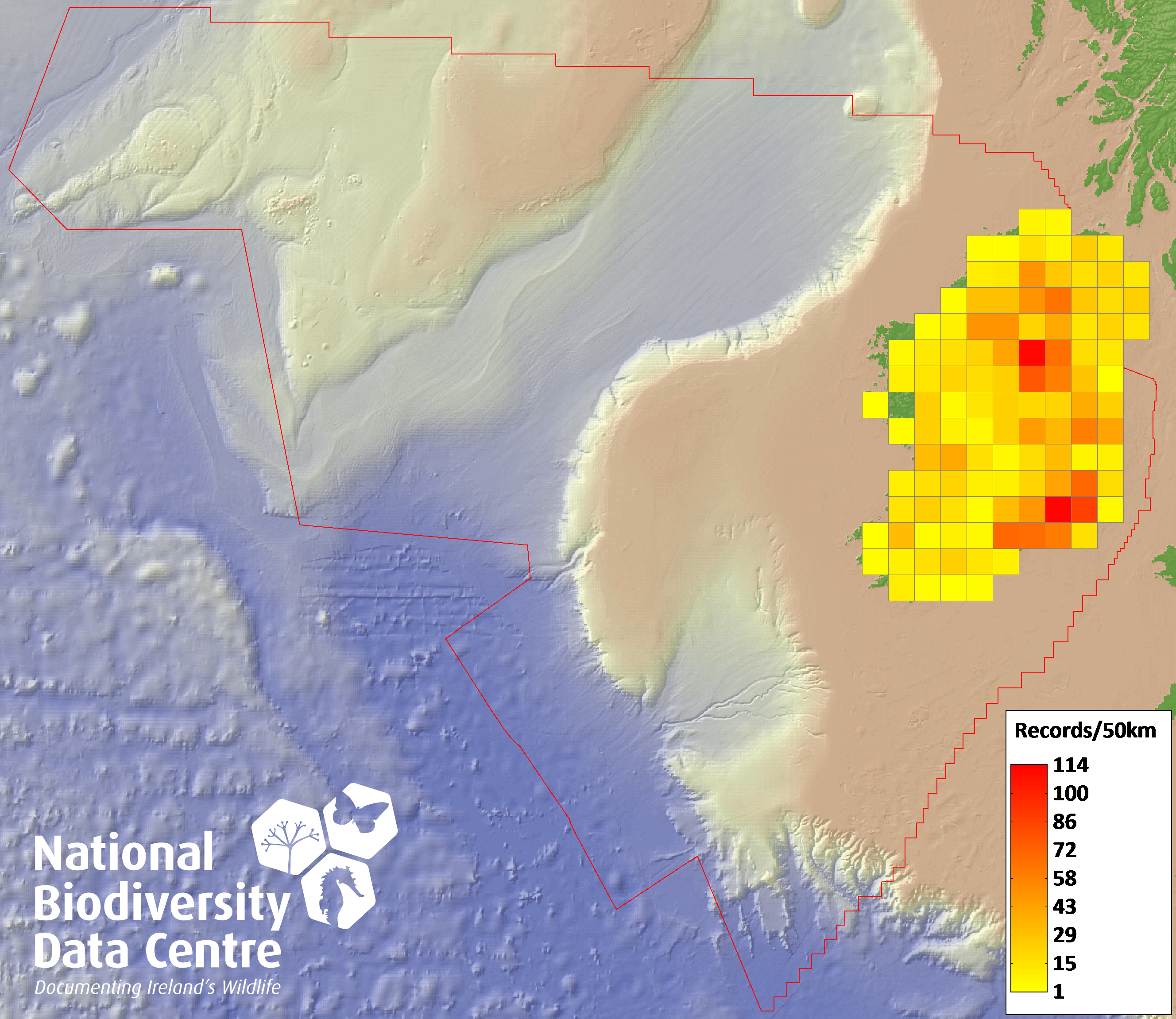 Distribution of the number of records recorded within each 10km grid square (ITM).Marine Map - 50km