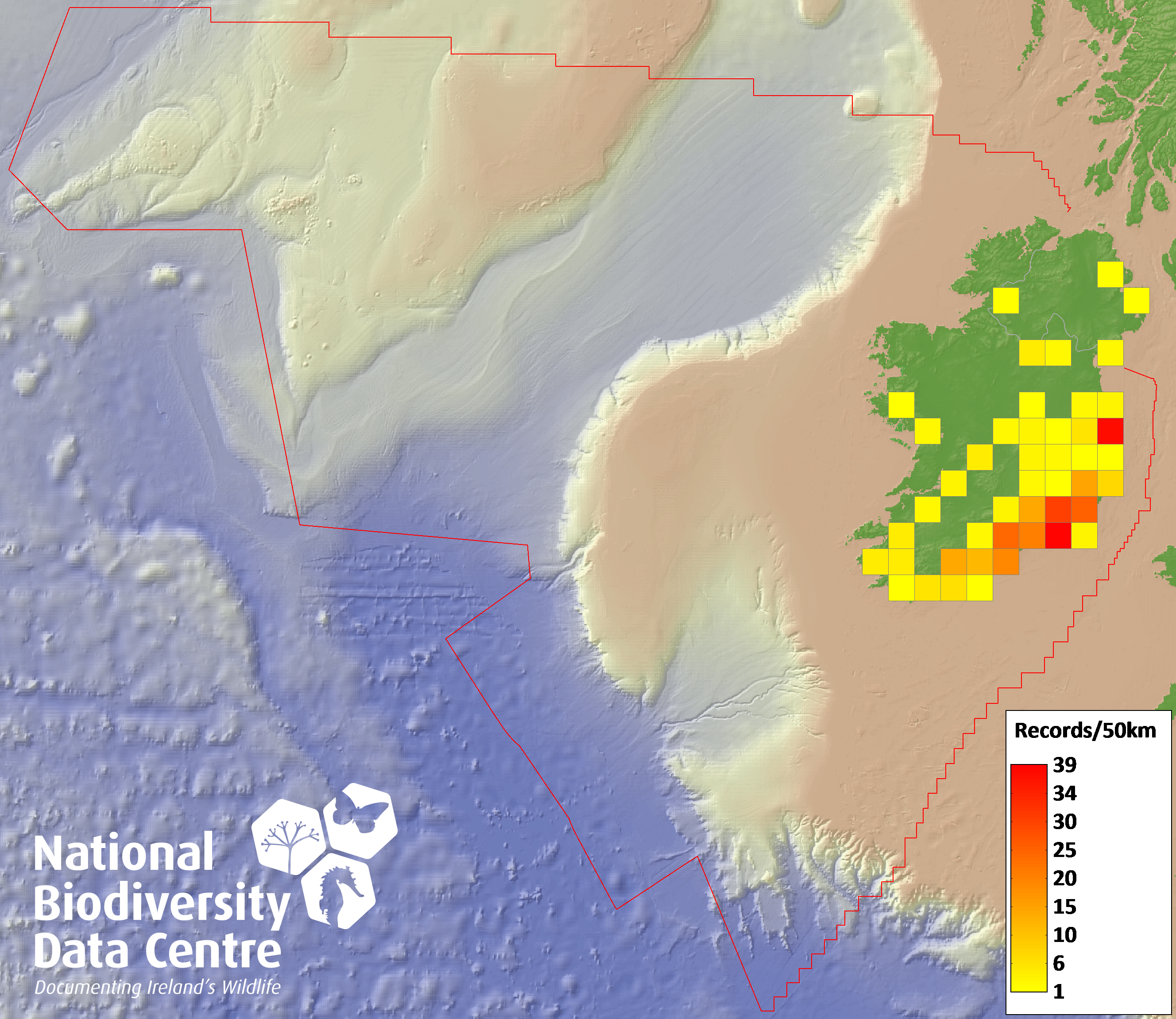 Distribution of the number of records recorded within each 10km grid square (ITM).Marine Map - 50km