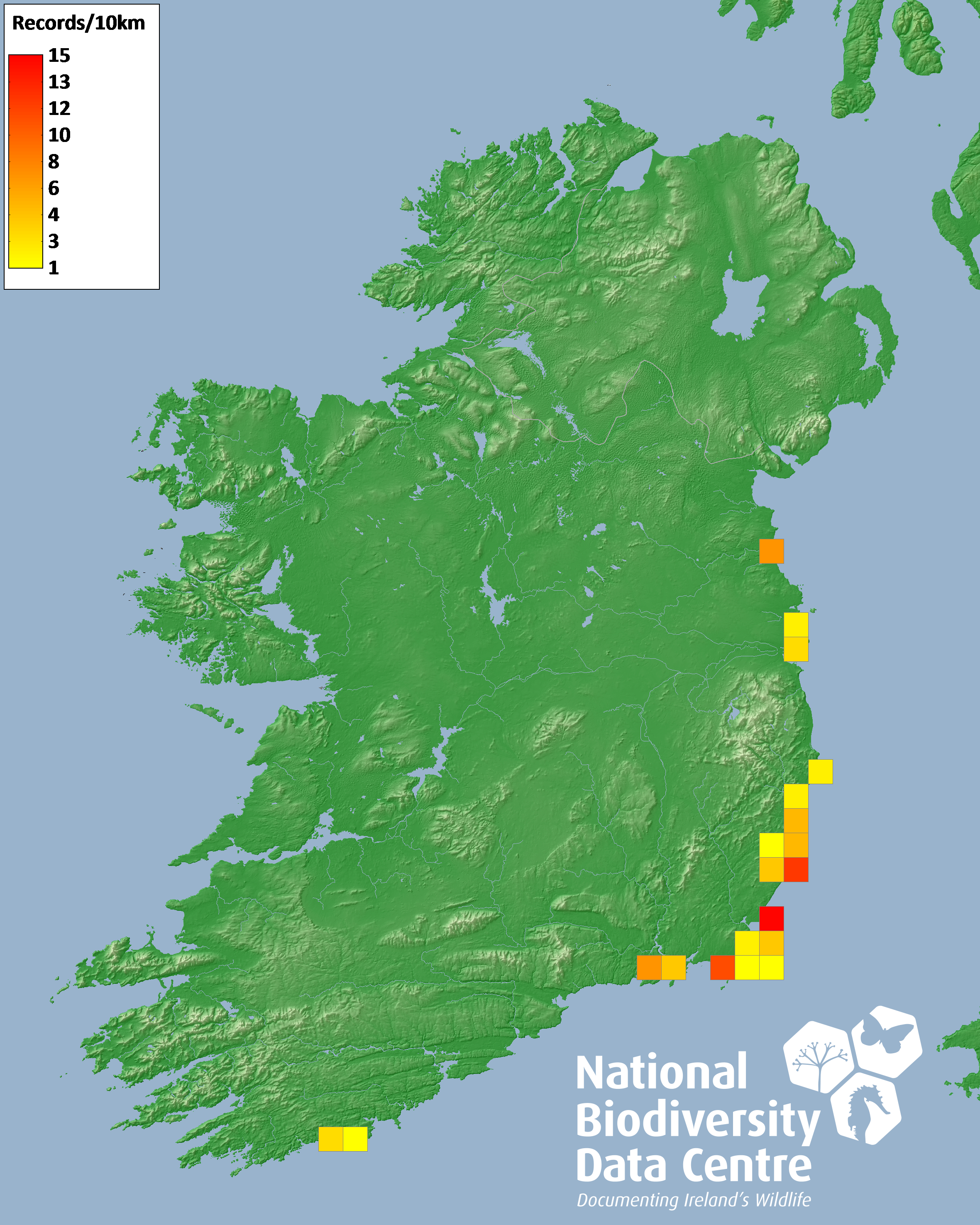Distribution of the number of records recorded within each 10km grid square (ITM).Marine Map - 50km