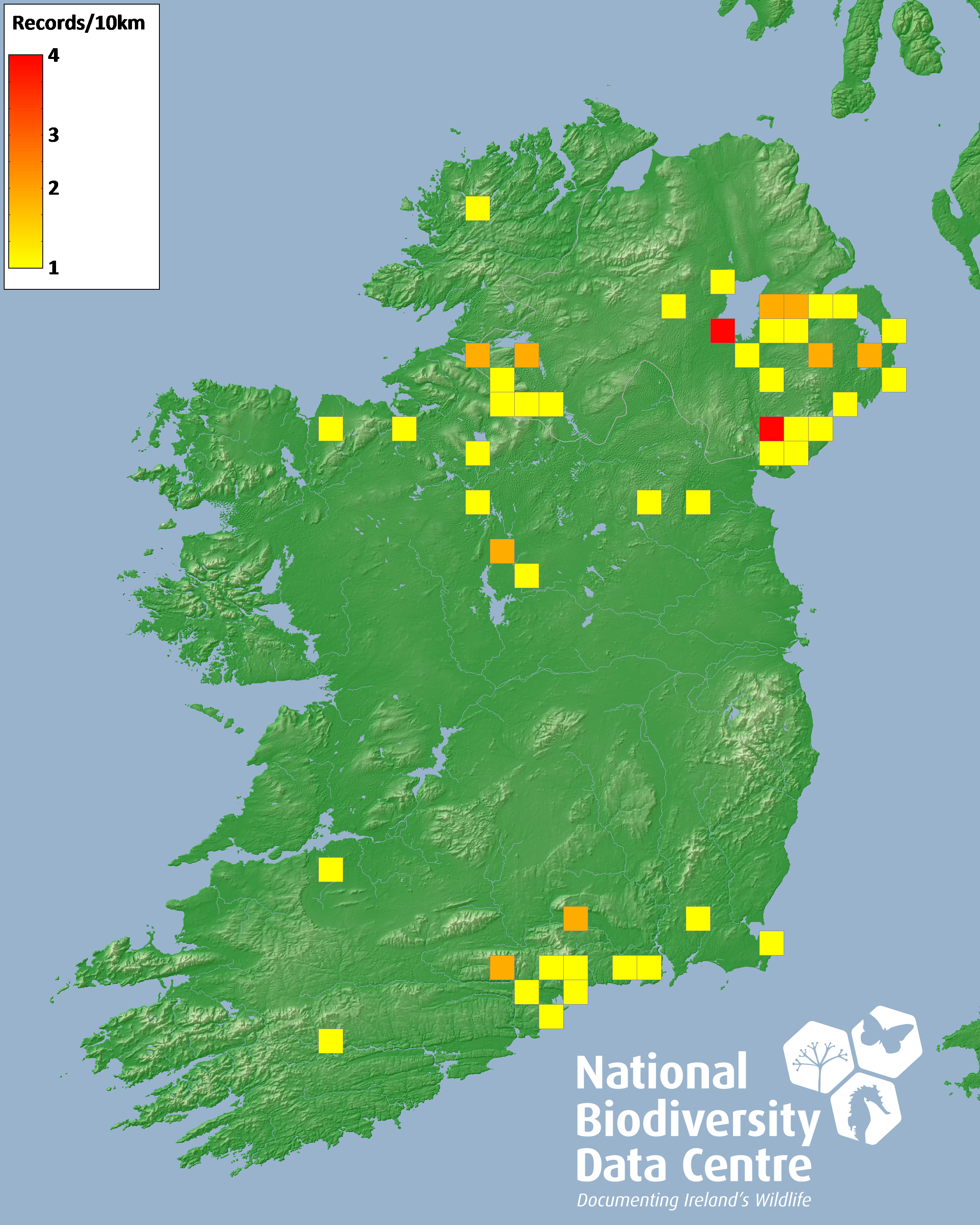 Distribution of the number of records recorded within each 10km grid square (ITM).Marine Map - 50km