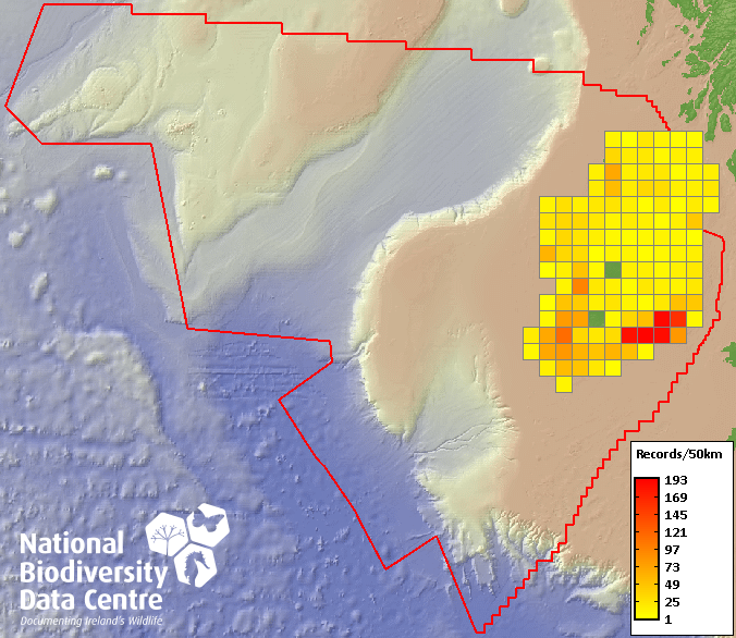 Distribution of the number of records recorded within each 10km grid square (ITM).Marine Map - 50km