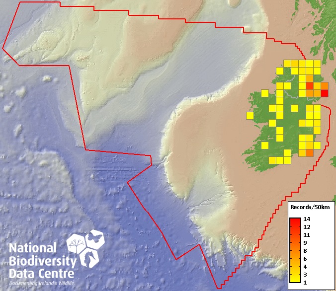 Distribution of the number of records recorded within each 10km grid square (ITM).Marine Map - 50km
