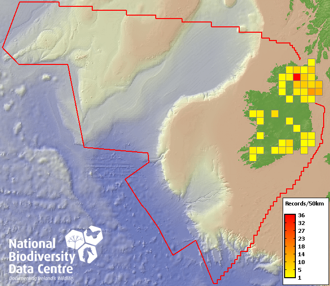 Distribution of the number of records recorded within each 10km grid square (ITM).Marine Map - 50km