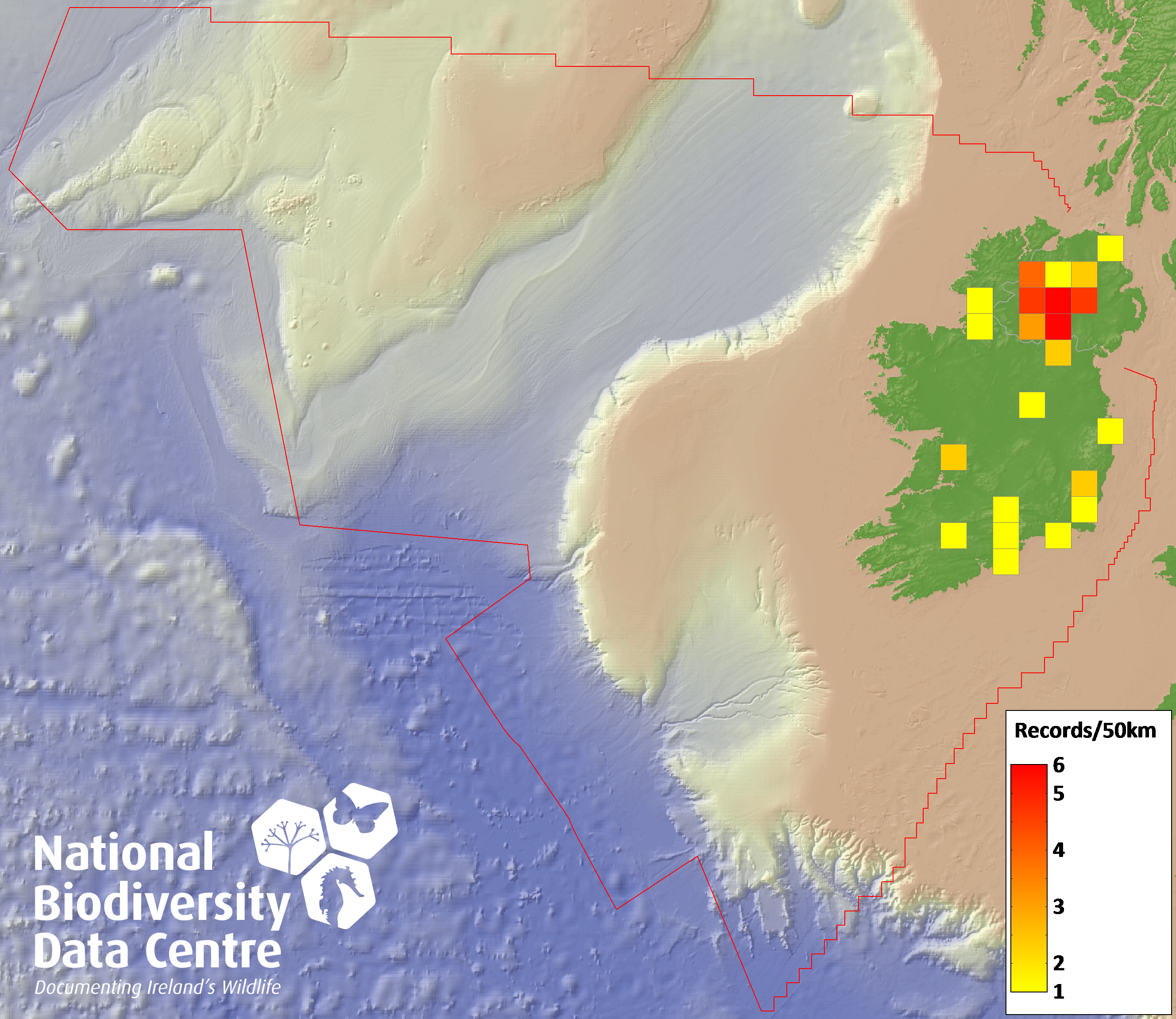 Distribution of the number of records recorded within each 10km grid square (ITM).Marine Map - 50km