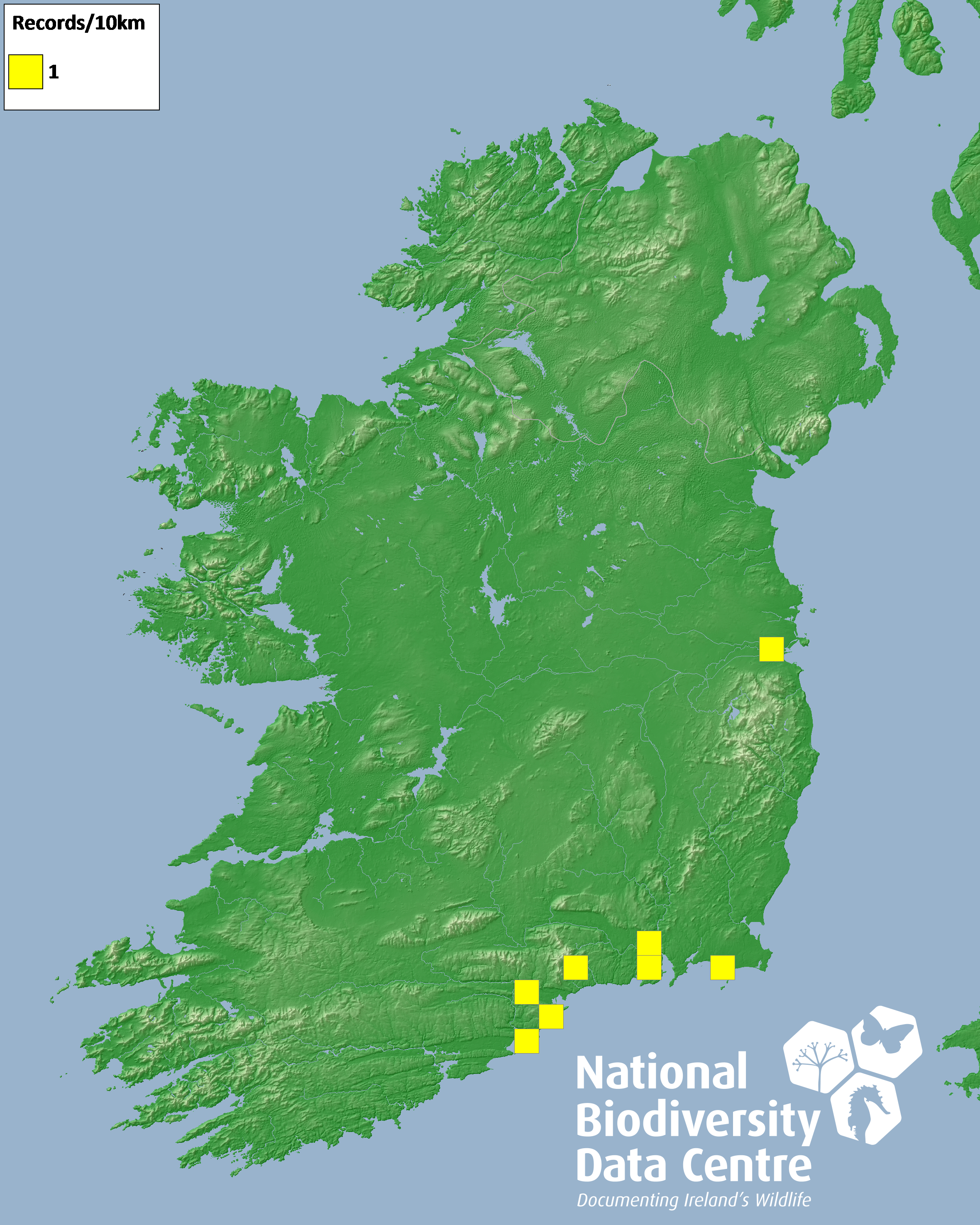 Distribution of the number of records recorded within each 10km grid square (ITM).Marine Map - 50km