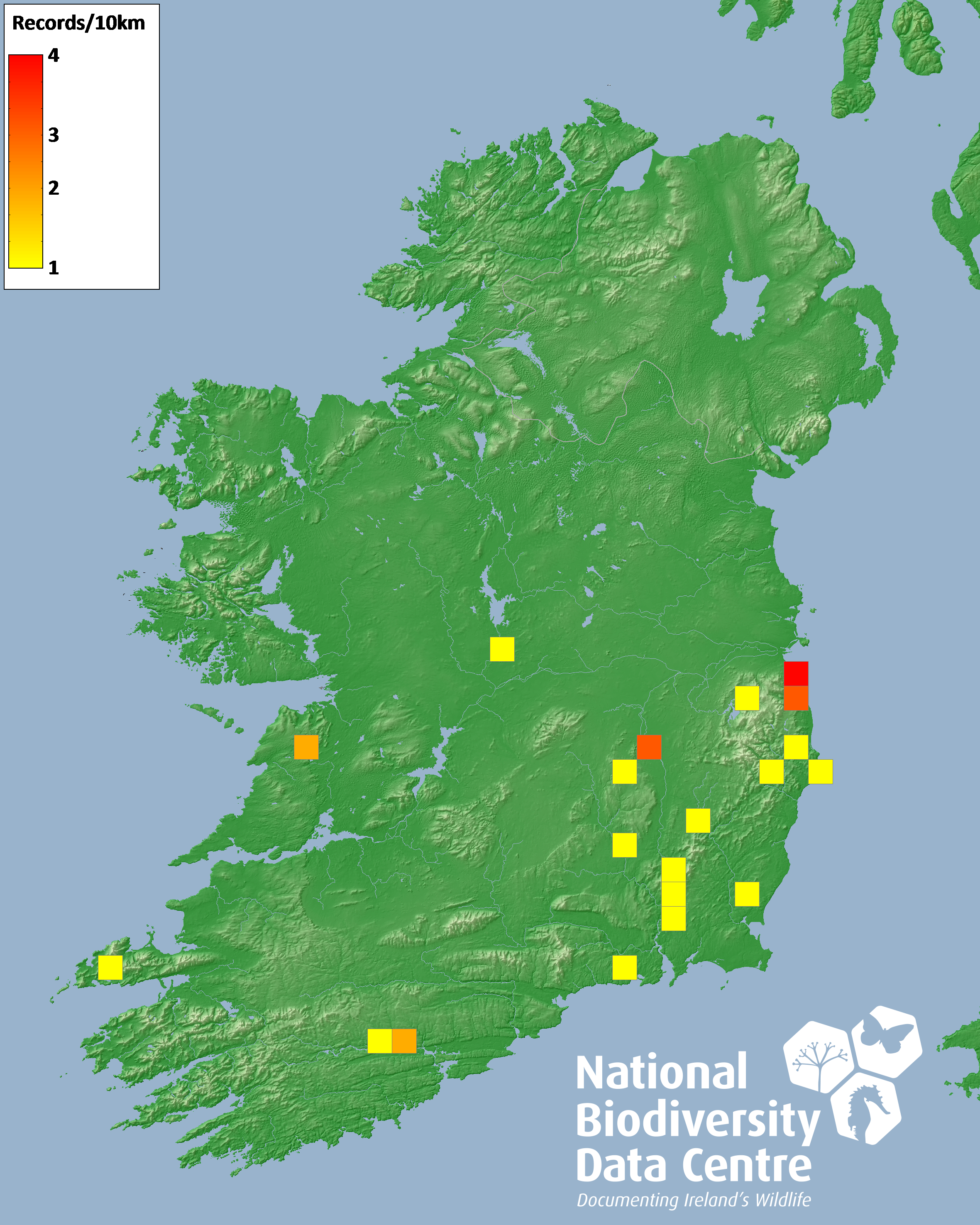 Distribution of the number of records recorded within each 10km grid square (ITM).Marine Map - 50km