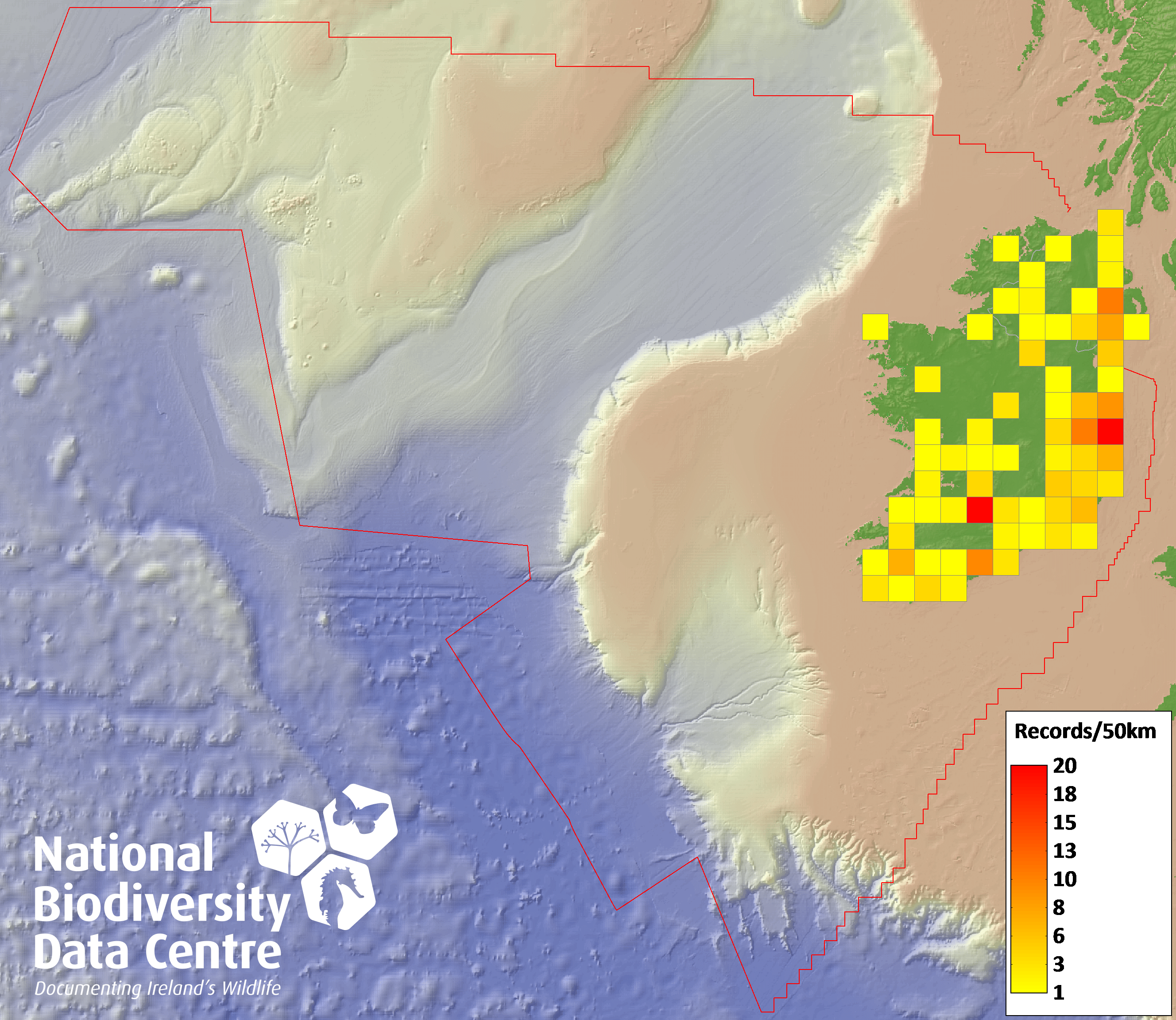 Distribution of the number of records recorded within each 10km grid square (ITM).Marine Map - 50km