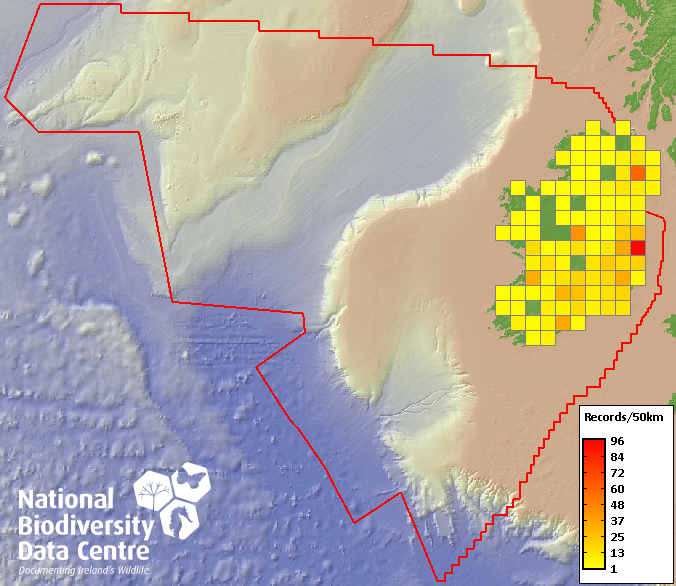 Distribution of the number of records recorded within each 10km grid square (ITM).Marine Map - 50km