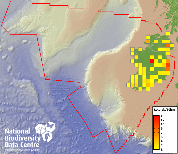Distribution of the number of records recorded within each 10km grid square (ITM).Marine Map - 50km