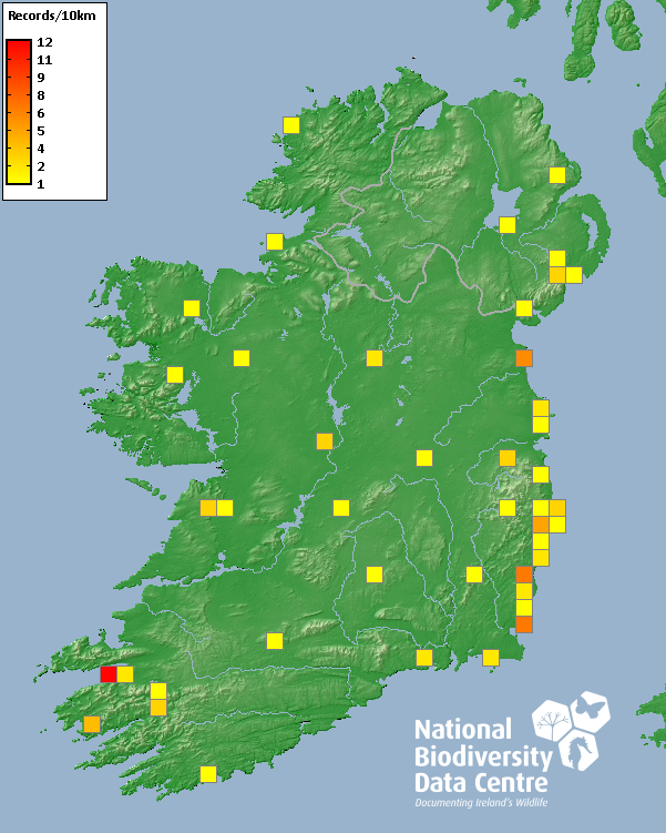 Distribution of the number of records recorded within each 10km grid square (ITM).Marine Map - 50km