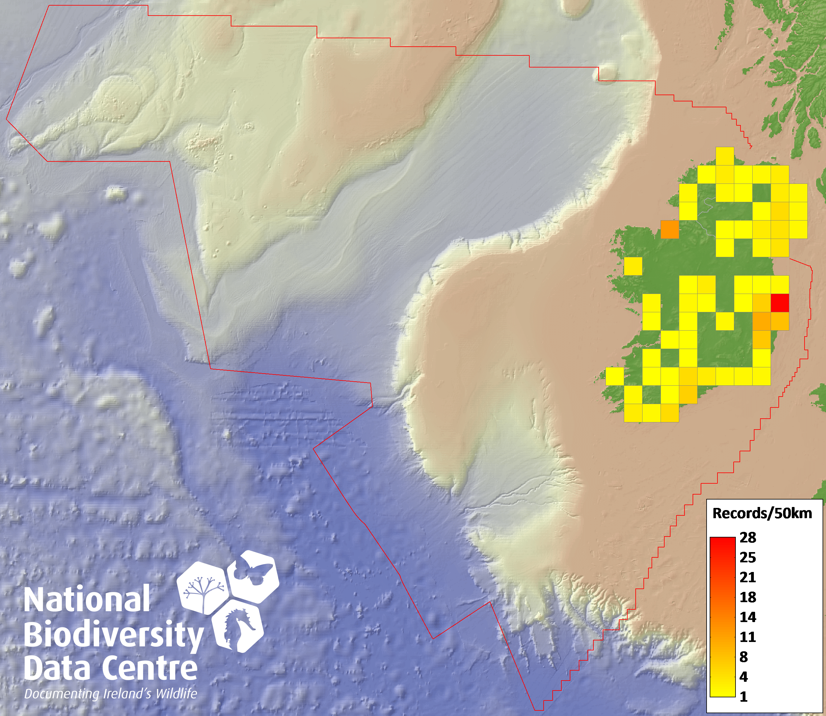Distribution of the number of records recorded within each 10km grid square (ITM).Marine Map - 50km