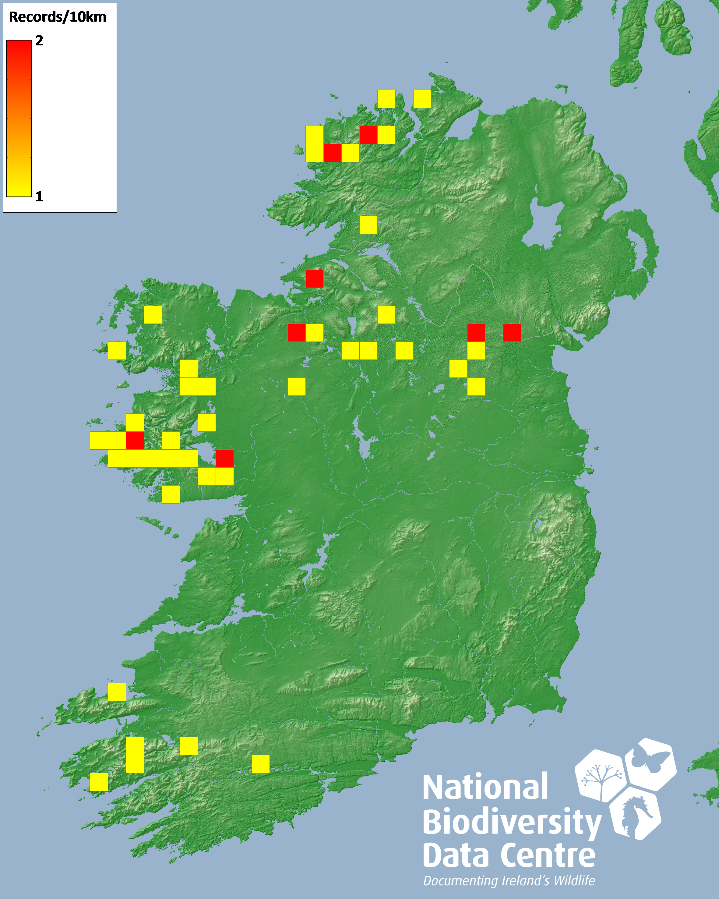 Distribution of the number of records recorded within each 10km grid square (ITM).Marine Map - 50km