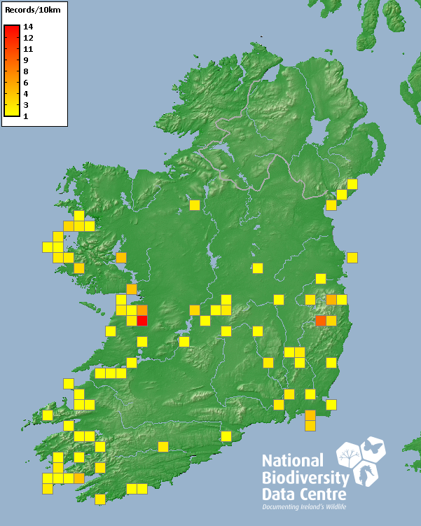 Distribution of the number of records recorded within each 10km grid square (ITM).Marine Map - 50km