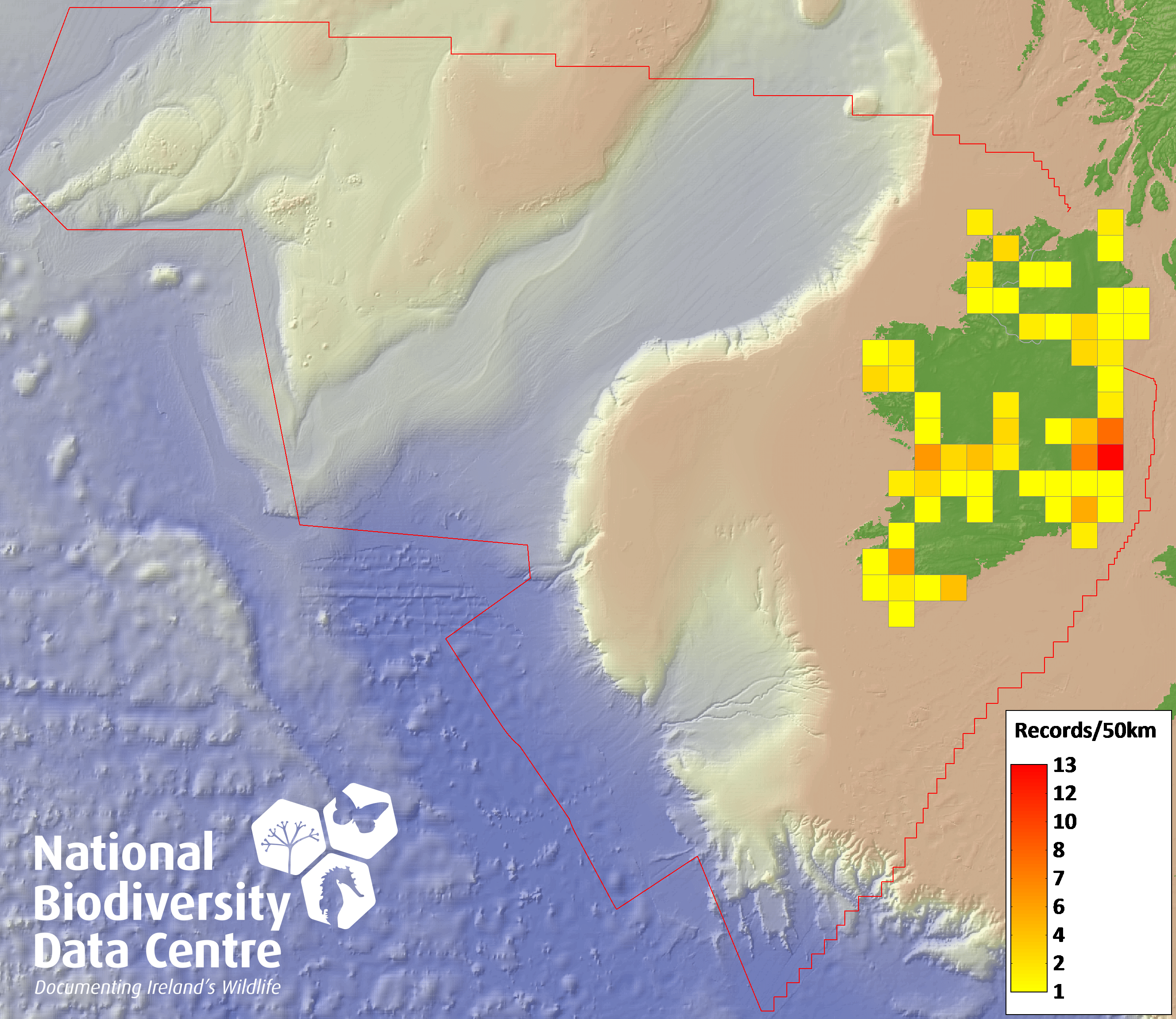 Distribution of the number of records recorded within each 10km grid square (ITM).Marine Map - 50km