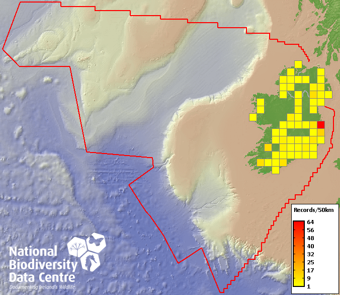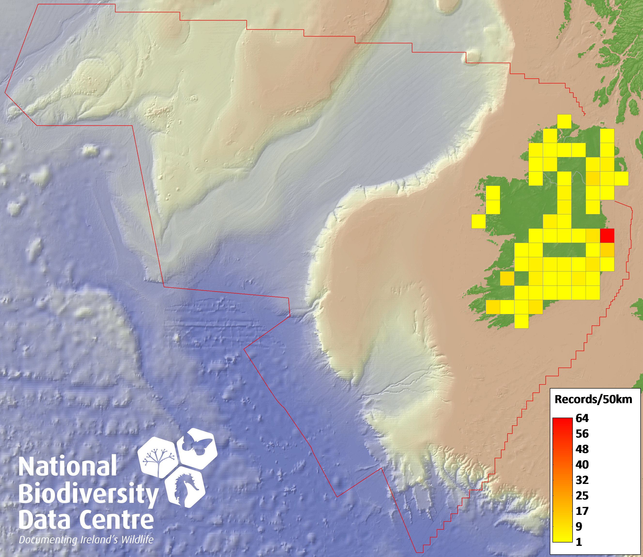 Distribution of the number of records recorded within each 10km grid square (ITM).Marine Map - 50km
