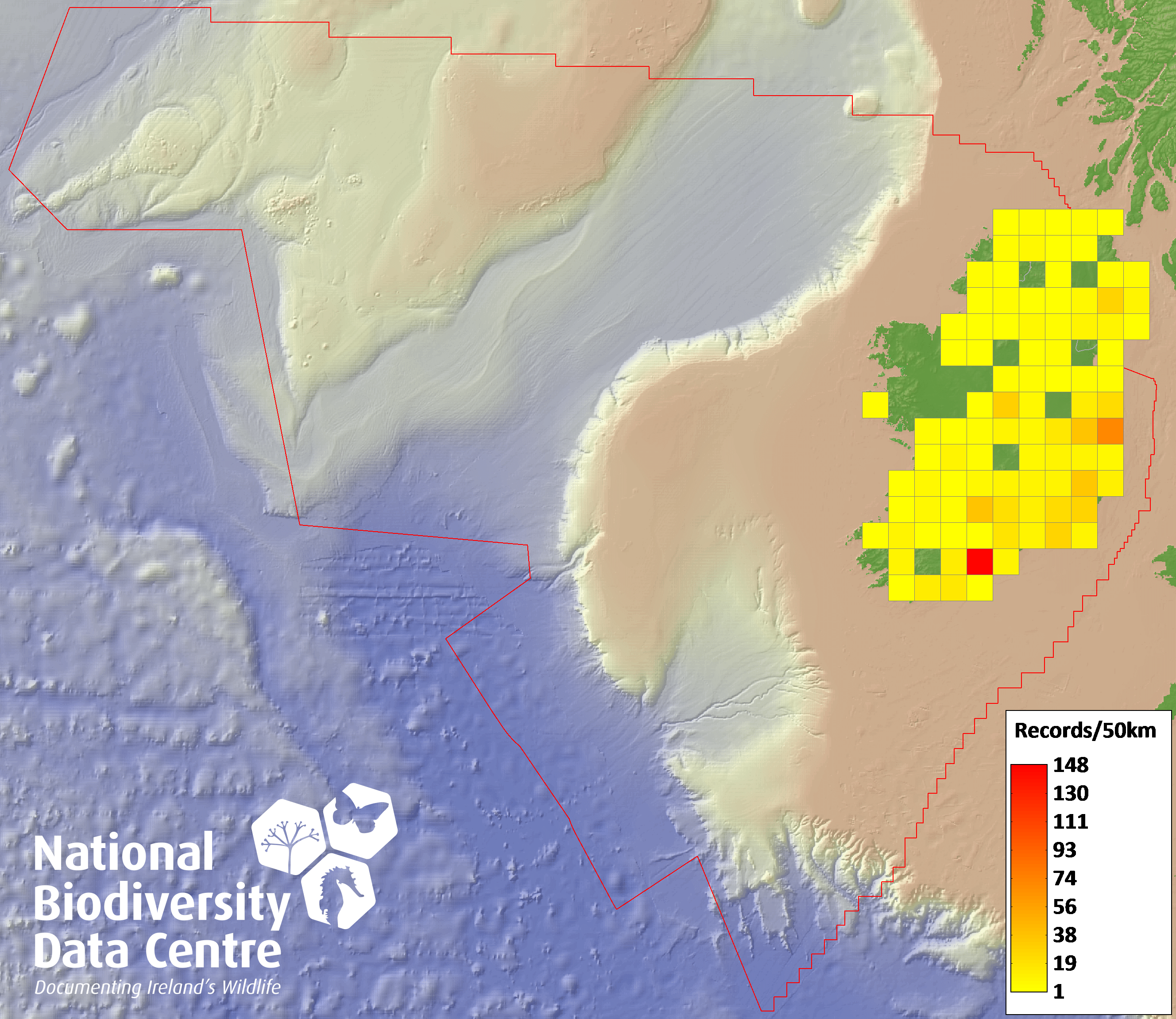 Distribution of the number of records recorded within each 10km grid square (ITM).Marine Map - 50km