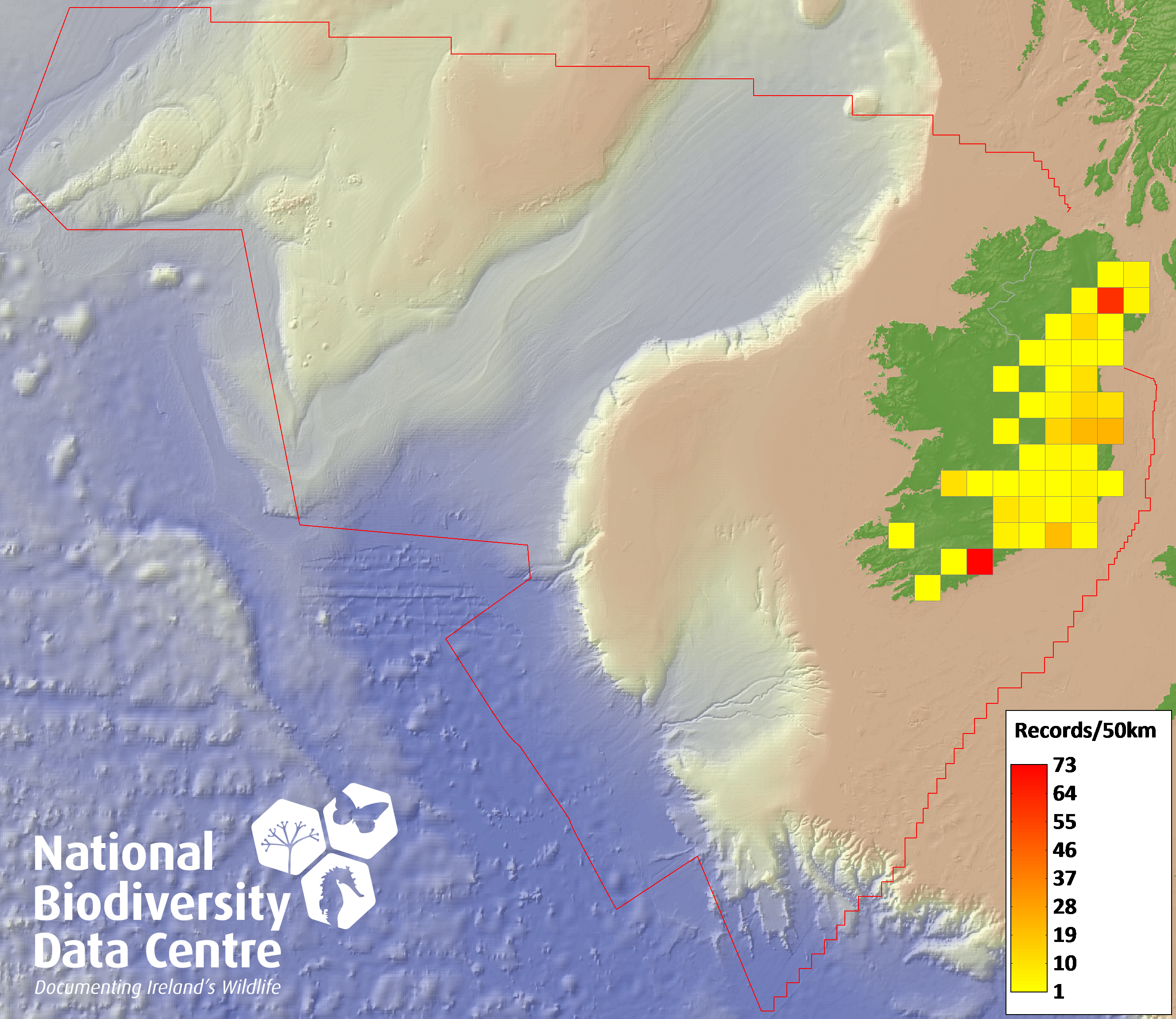 Distribution of the number of records recorded within each 10km grid square (ITM).Marine Map - 50km