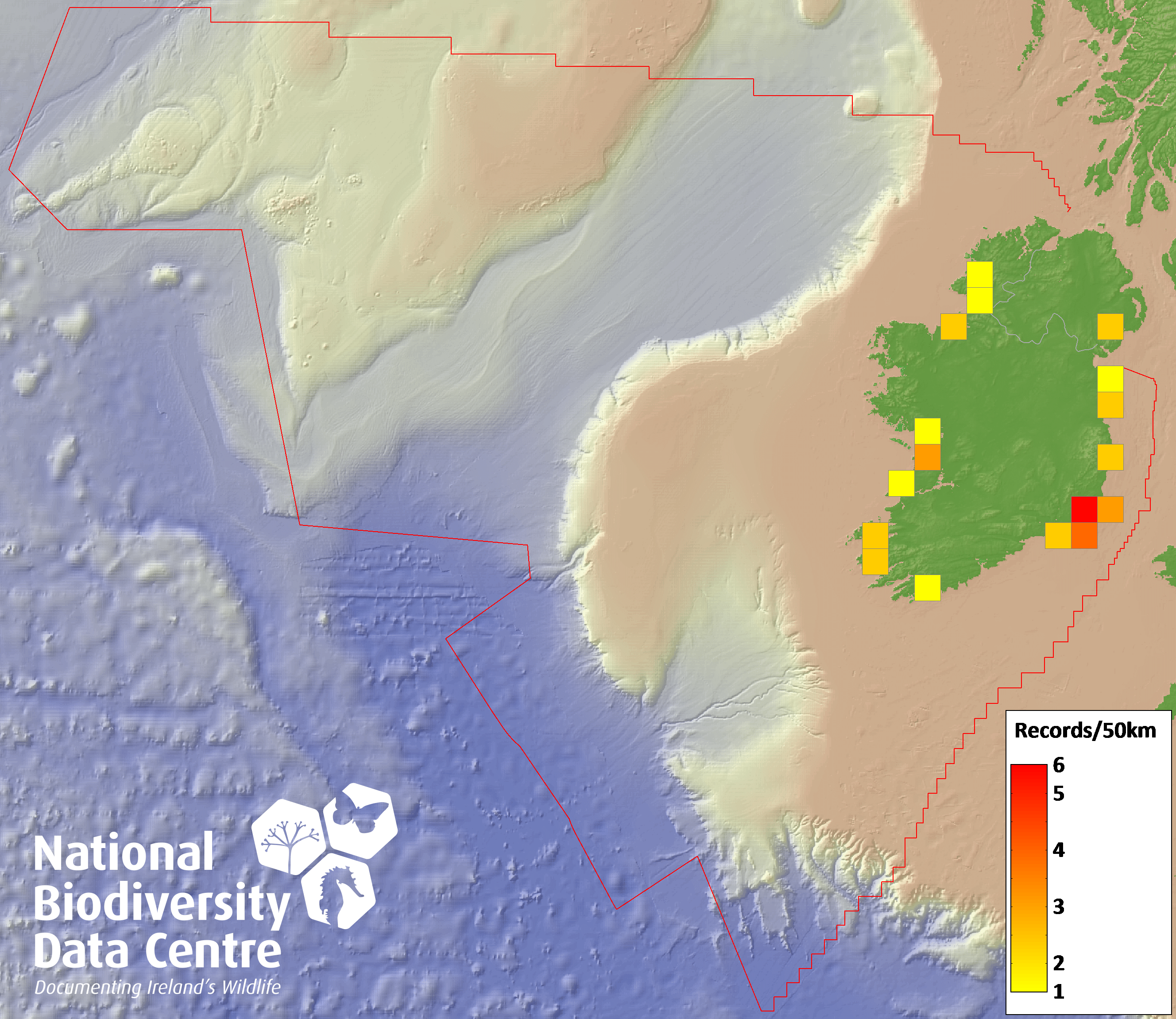 Distribution of the number of records recorded within each 10km grid square (ITM).Marine Map - 50km