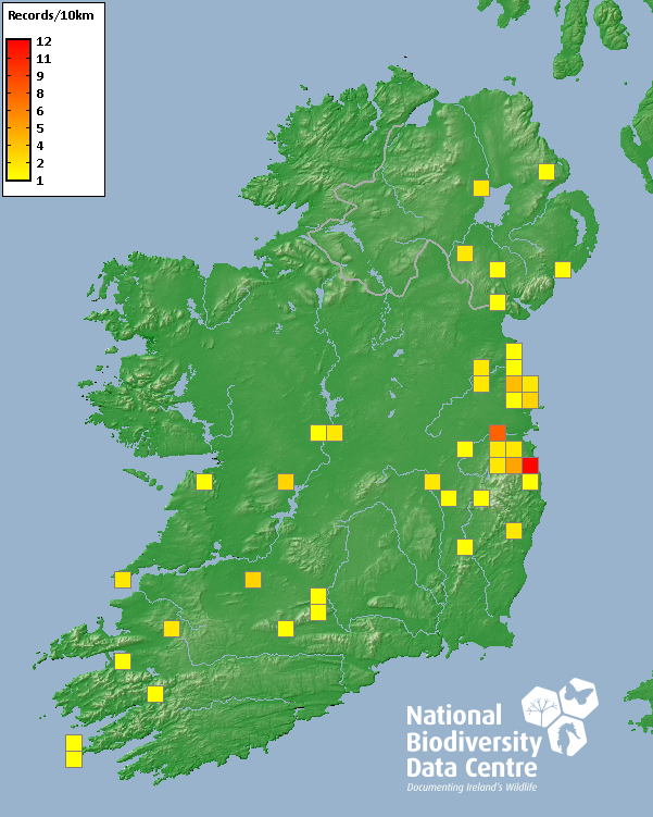 Distribution of the number of records recorded within each 10km grid square (ITM).Marine Map - 50km