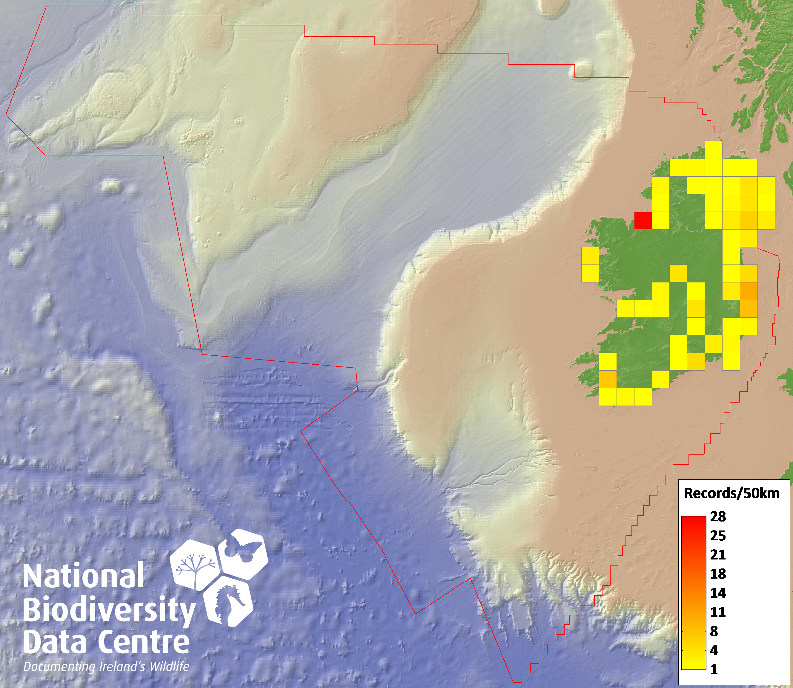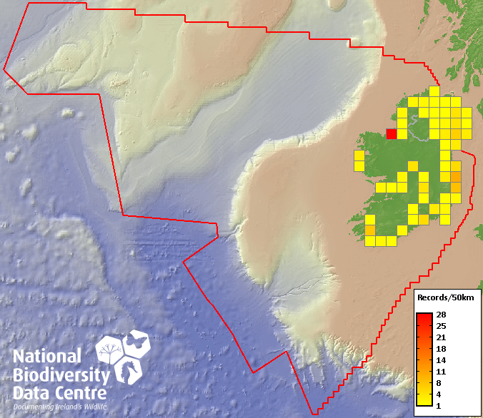 Distribution of the number of records recorded within each 10km grid square (ITM).Marine Map - 50km