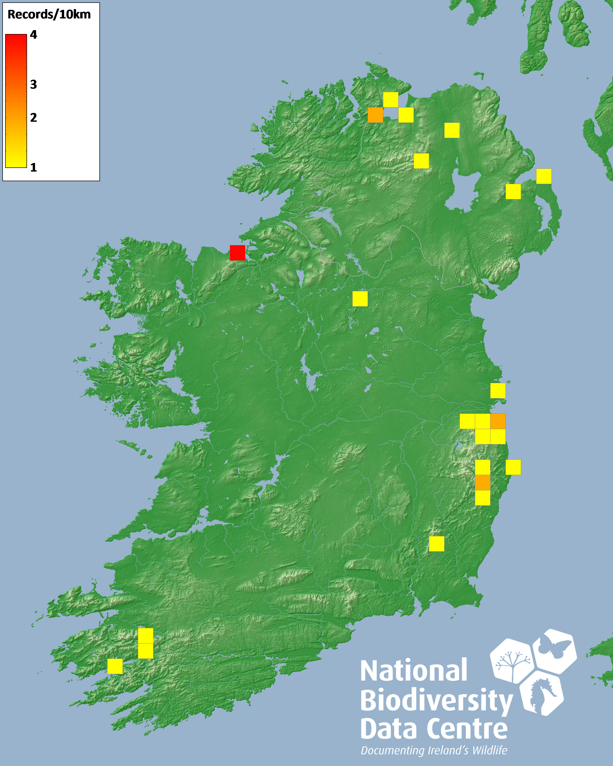 Distribution of the number of records recorded within each 10km grid square (ITM).Marine Map - 50km