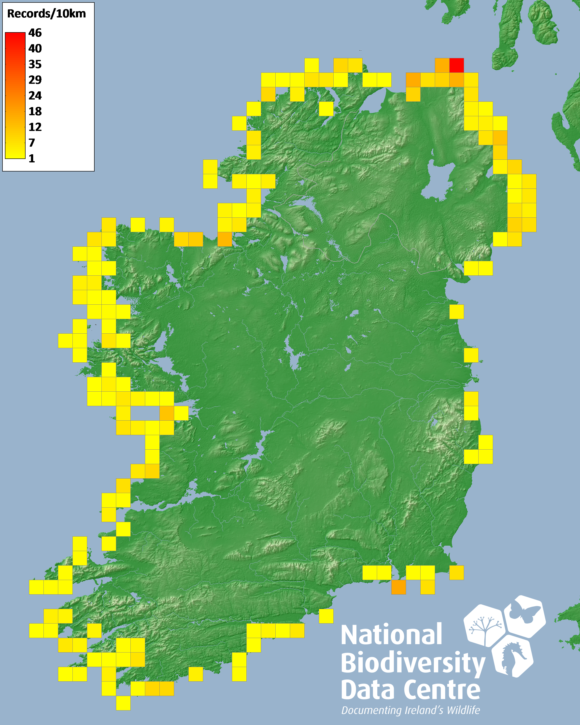 Distribution of the number of records recorded within each 10km grid square (ITM).Marine Map - 50km