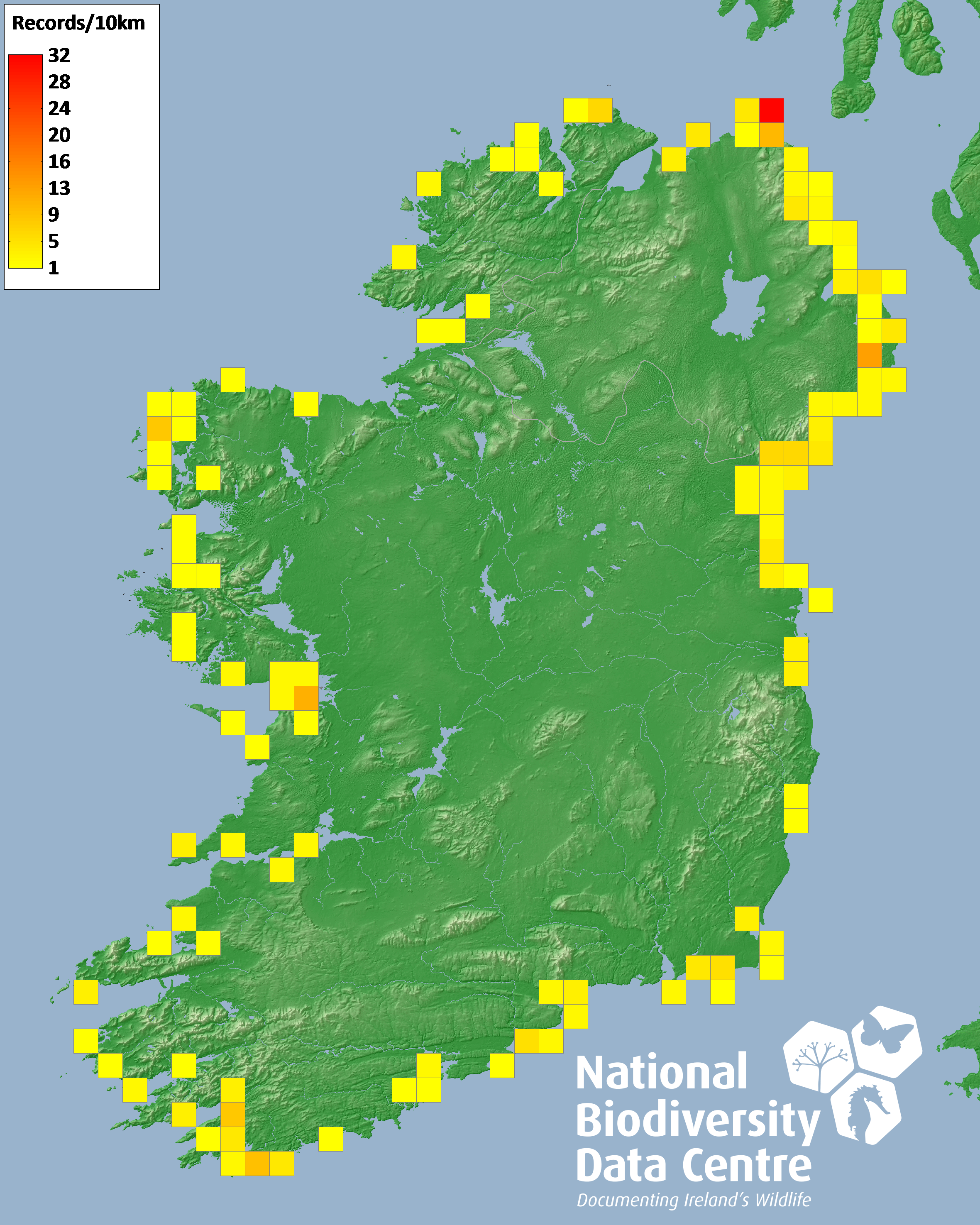 Distribution of the number of records recorded within each 10km grid square (ITM).Marine Map - 50km