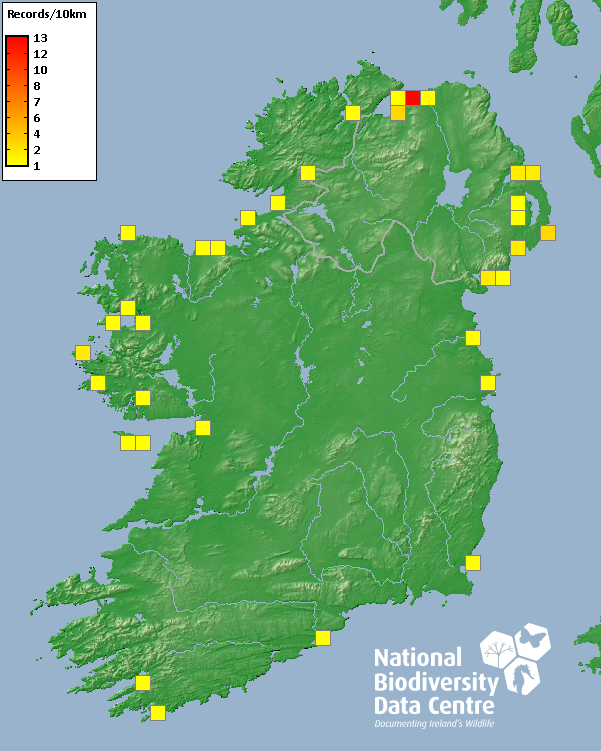Distribution of the number of records recorded within each 10km grid square (ITM).Marine Map - 50km