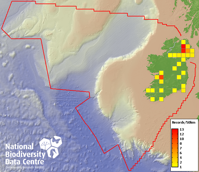 Distribution of the number of records recorded within each 10km grid square (ITM).Marine Map - 50km