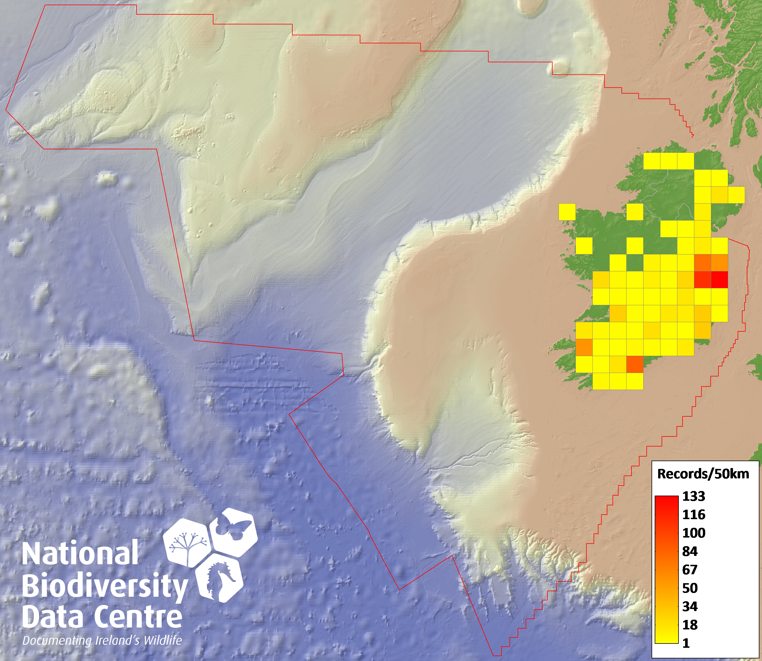 Distribution of the number of records recorded within each 10km grid square (ITM).Marine Map - 50km