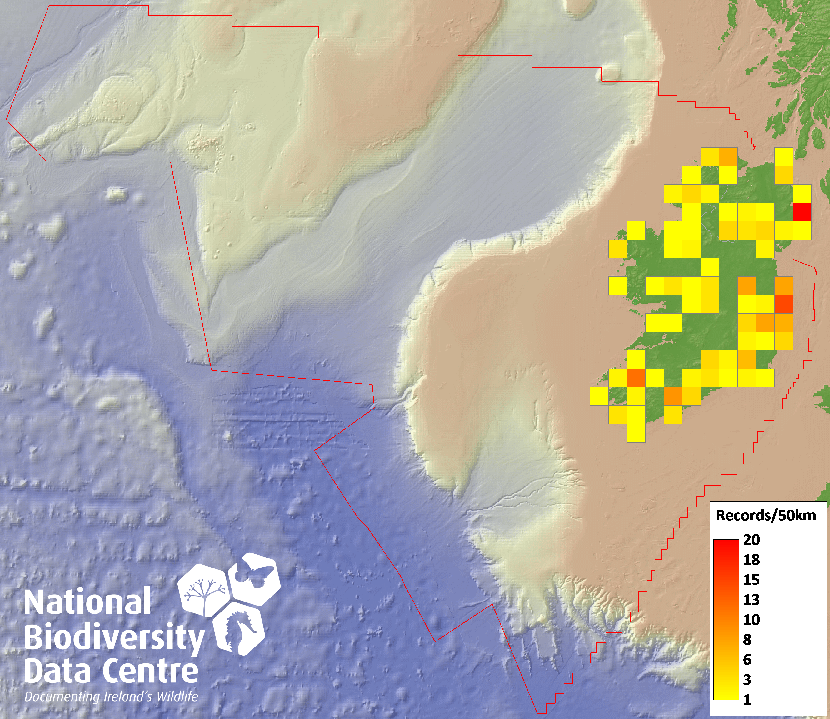 Distribution of the number of records recorded within each 10km grid square (ITM).Marine Map - 50km
