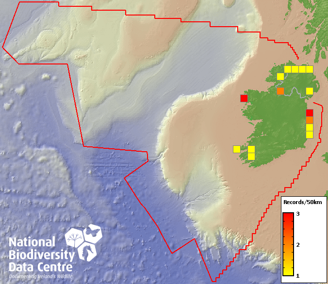 Distribution of the number of records recorded within each 10km grid square (ITM).Marine Map - 50km