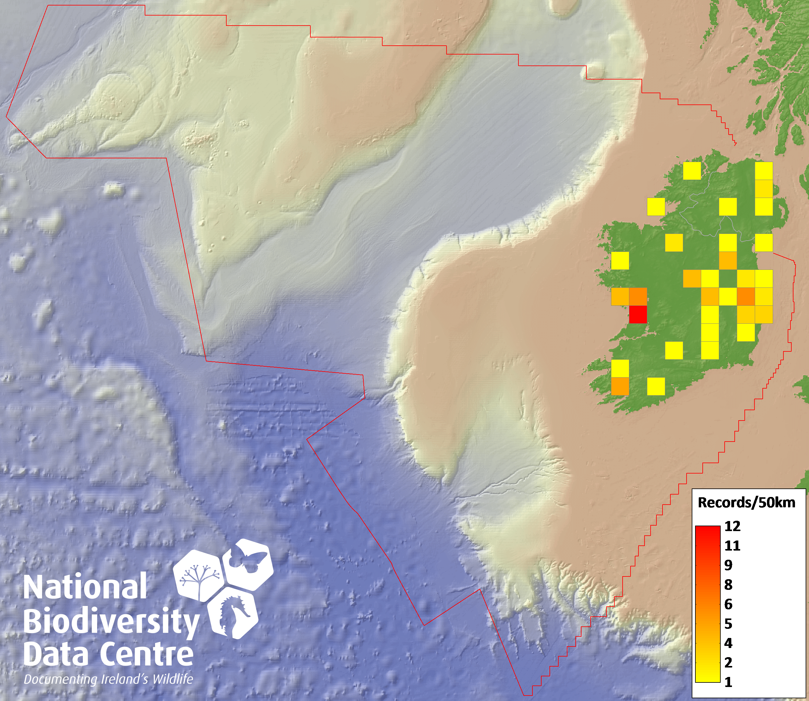Distribution of the number of records recorded within each 10km grid square (ITM).Marine Map - 50km