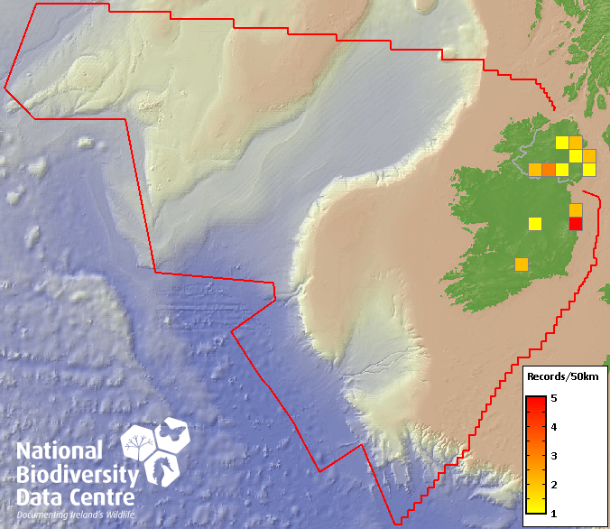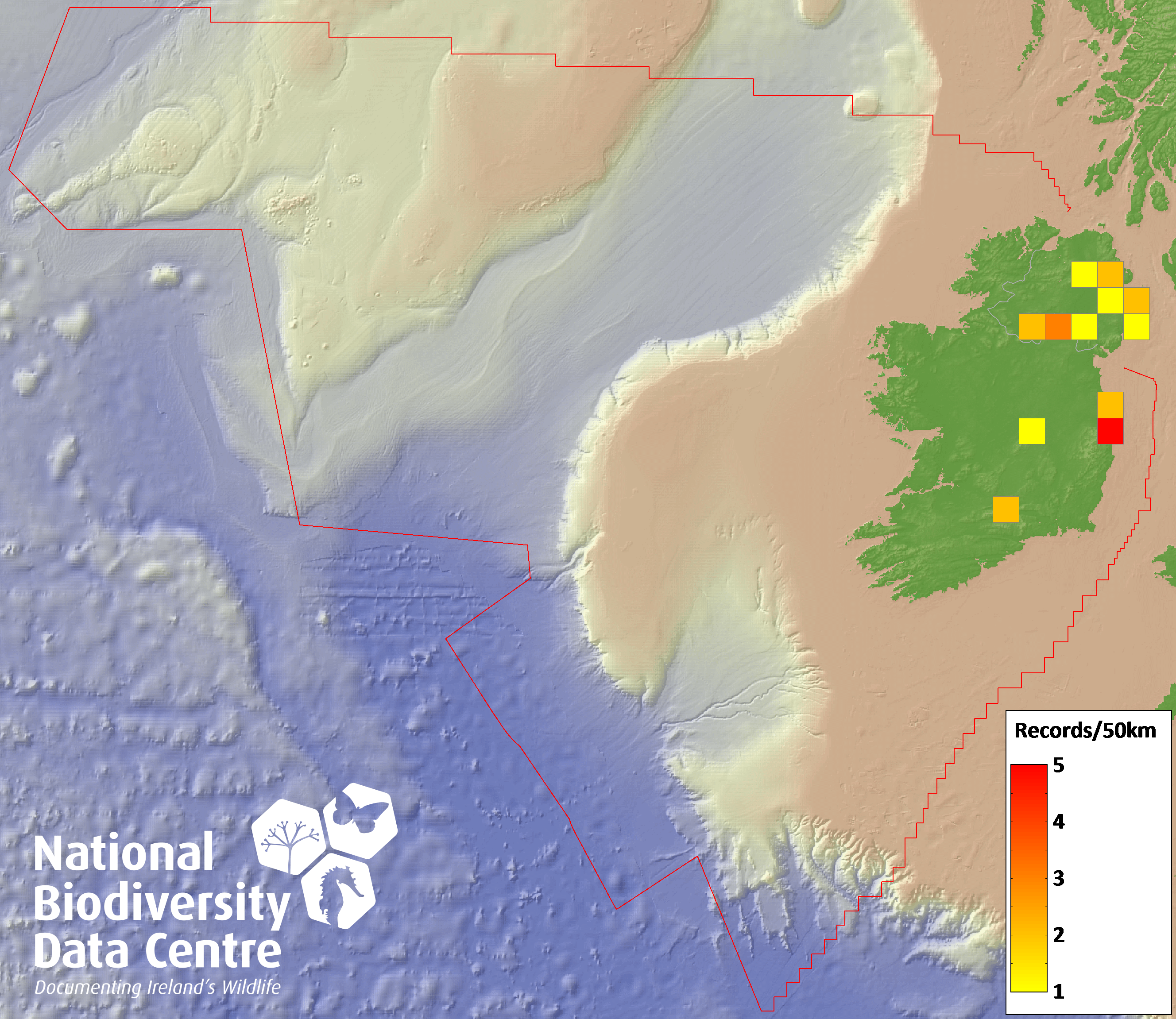 Distribution of the number of records recorded within each 10km grid square (ITM).Marine Map - 50km