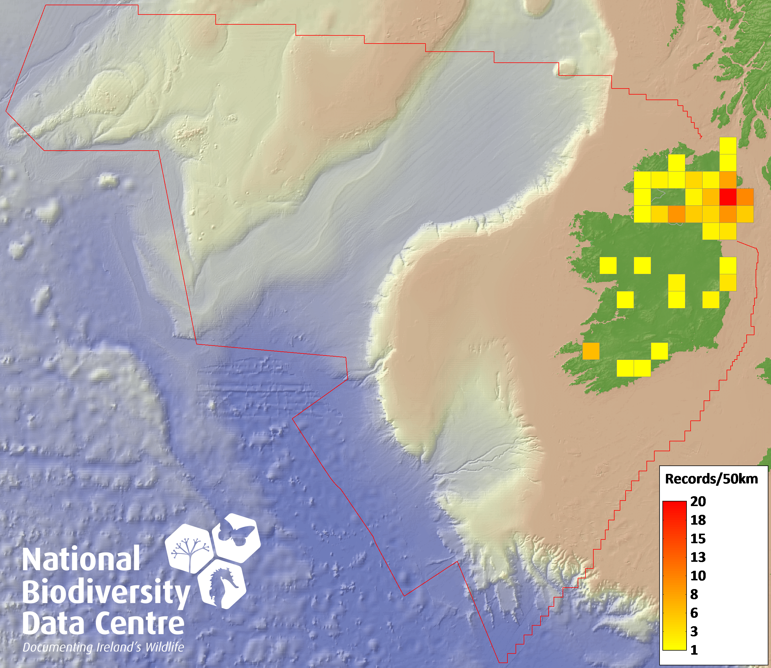 Distribution of the number of records recorded within each 10km grid square (ITM).Marine Map - 50km