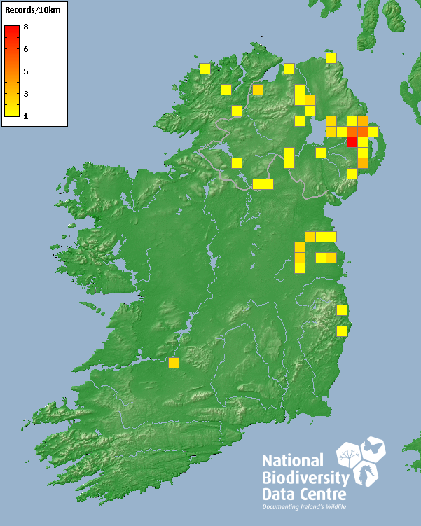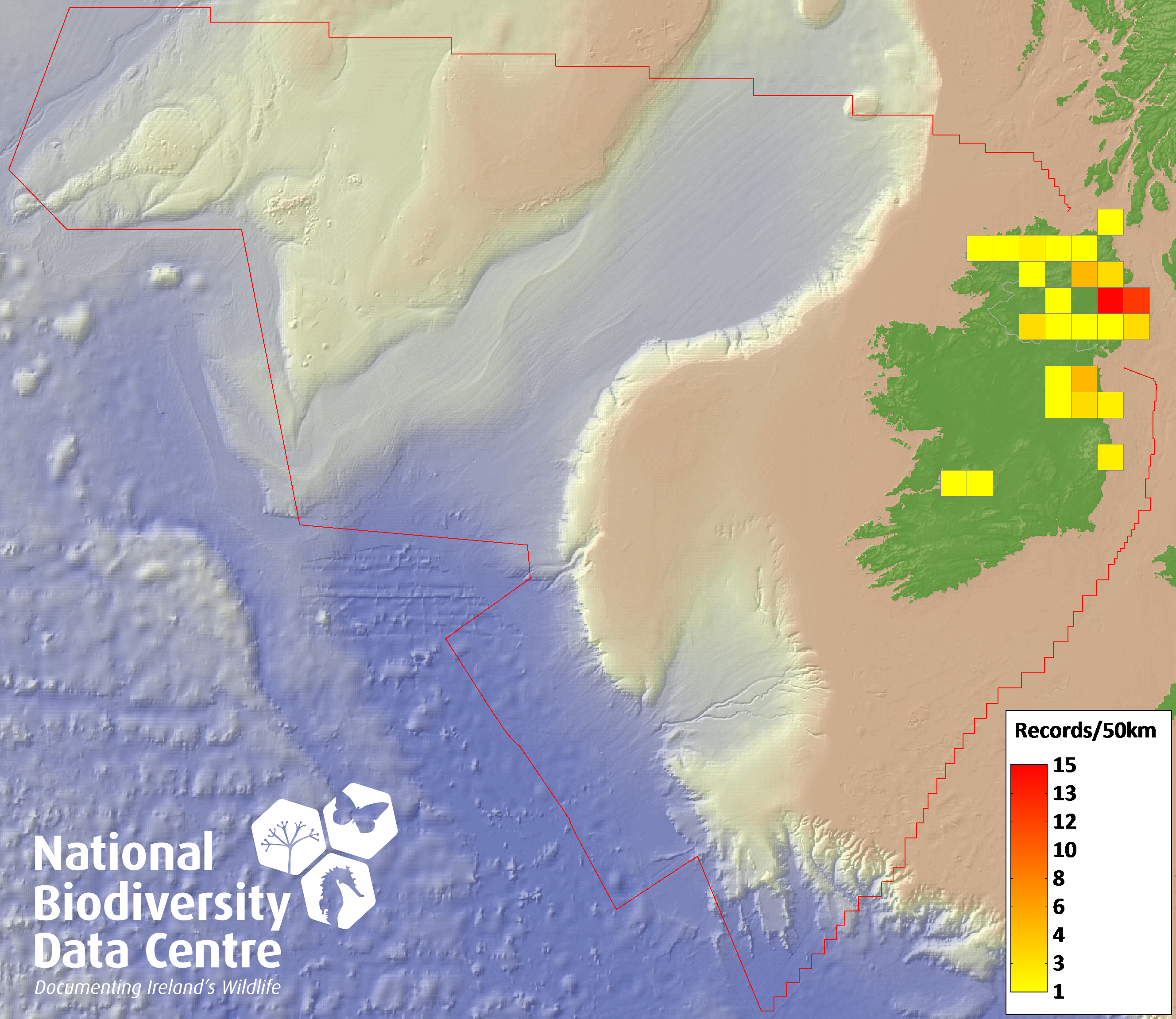 Distribution of the number of records recorded within each 10km grid square (ITM).Marine Map - 50km