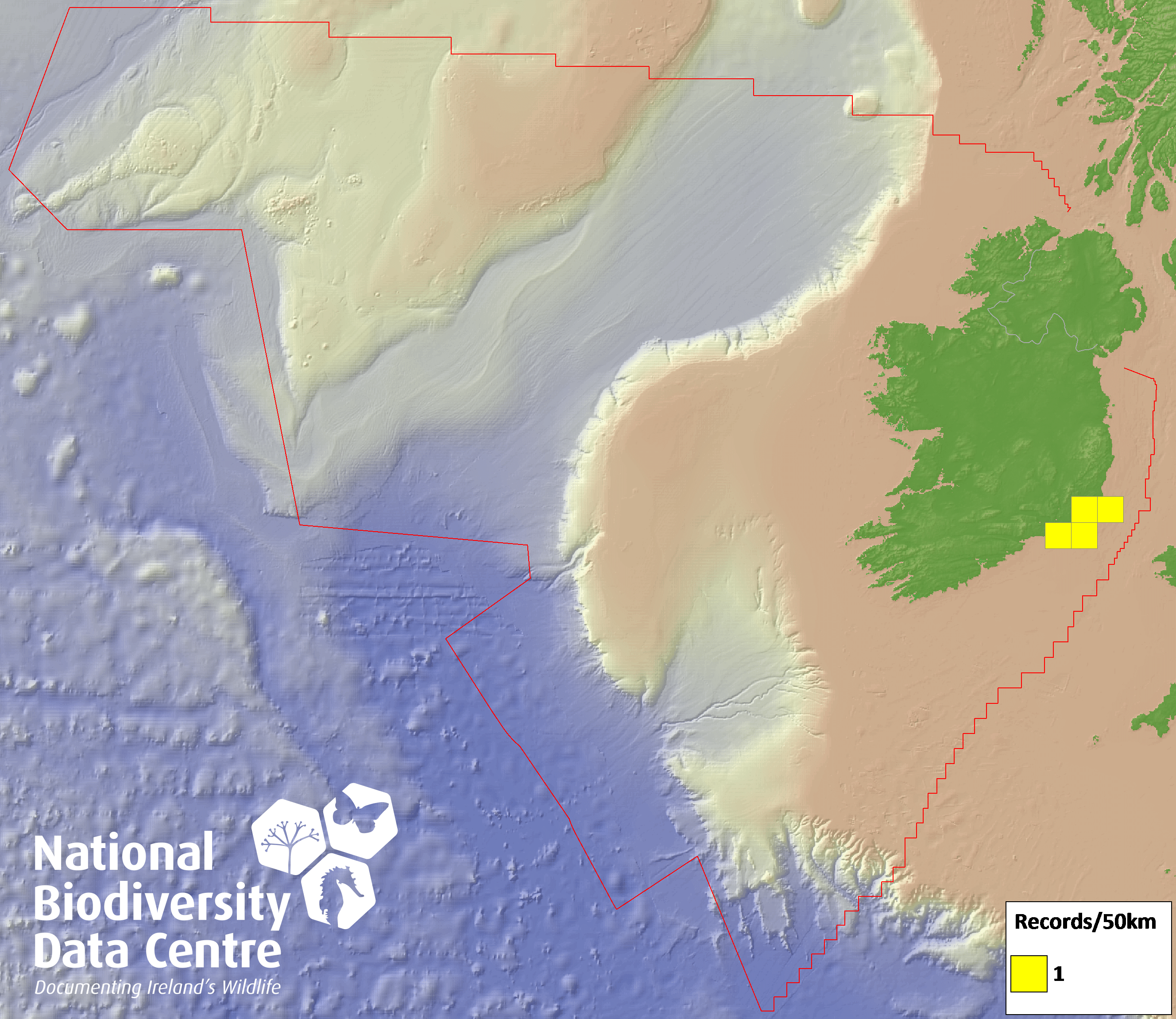 Distribution of the number of records recorded within each 10km grid square (ITM).Marine Map - 50km