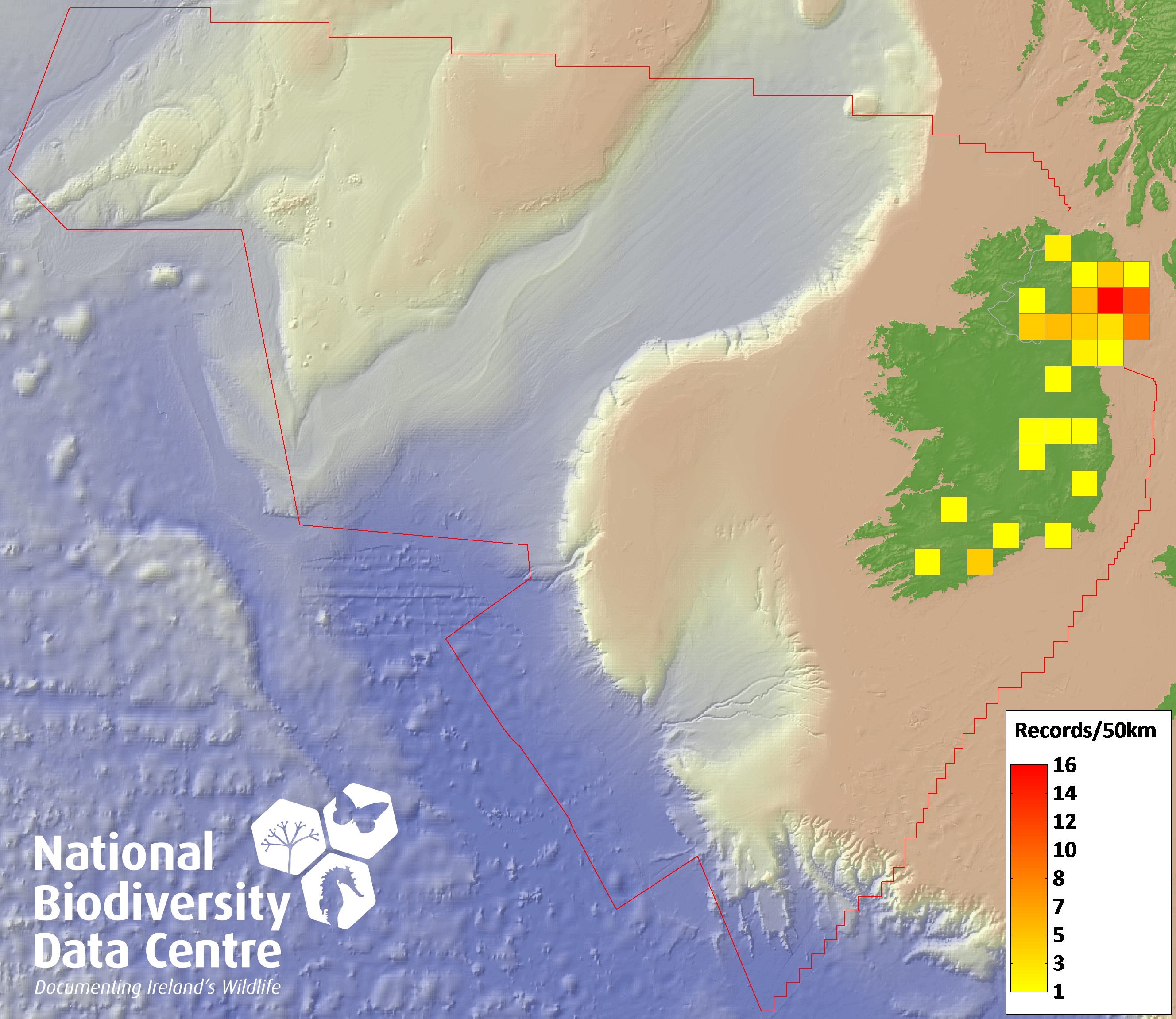 Distribution of the number of records recorded within each 10km grid square (ITM).Marine Map - 50km