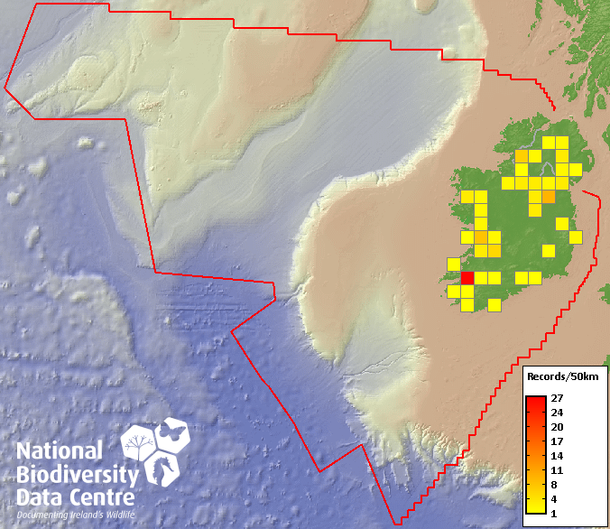 Distribution of the number of records recorded within each 10km grid square (ITM).Marine Map - 50km