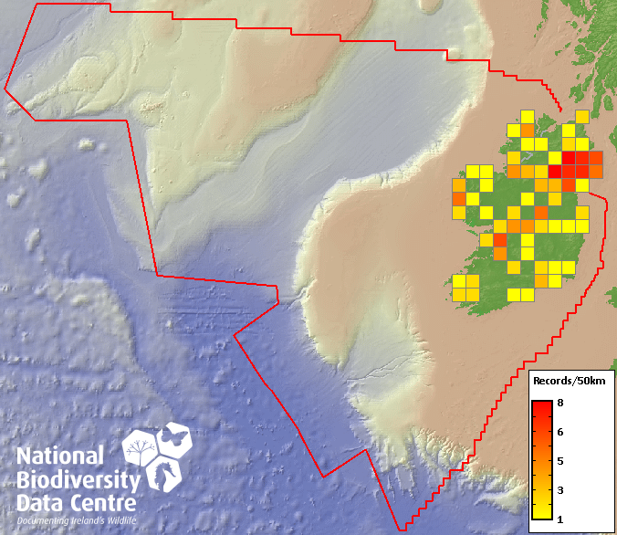 Distribution of the number of records recorded within each 10km grid square (ITM).Marine Map - 50km