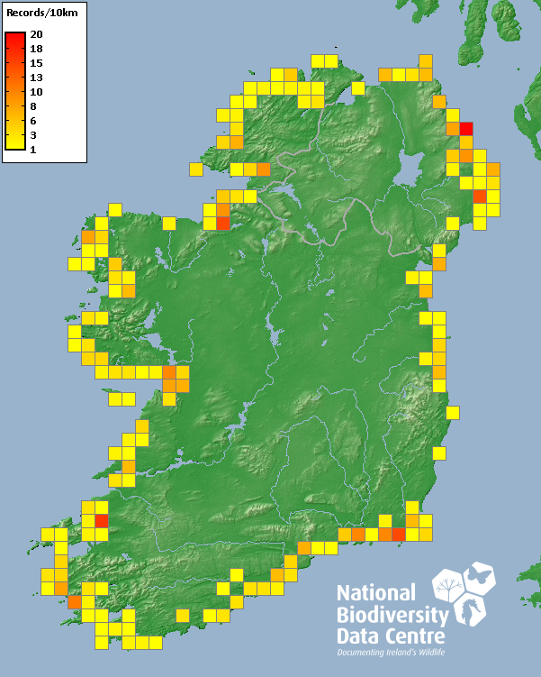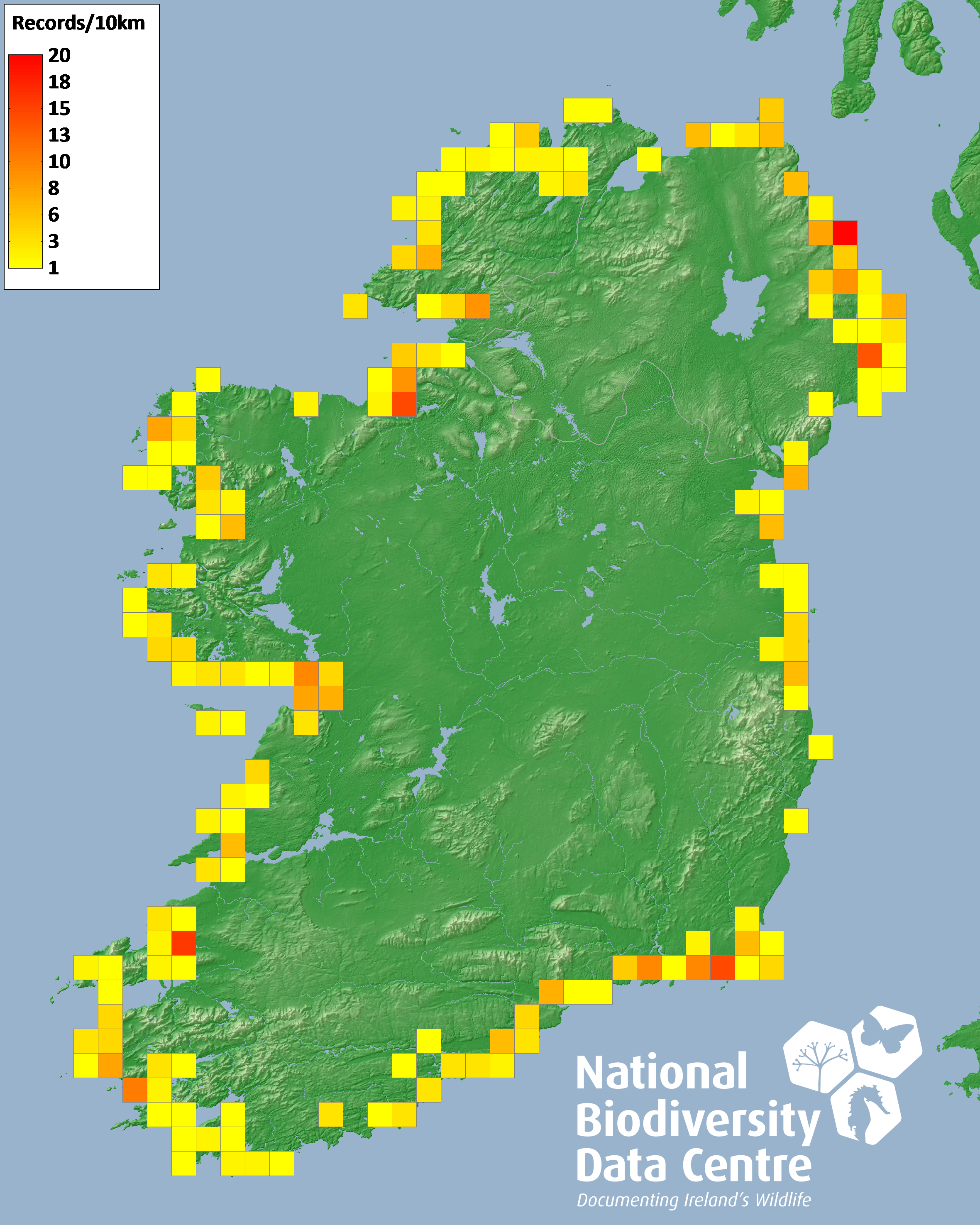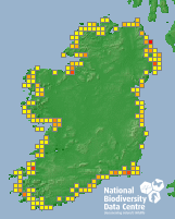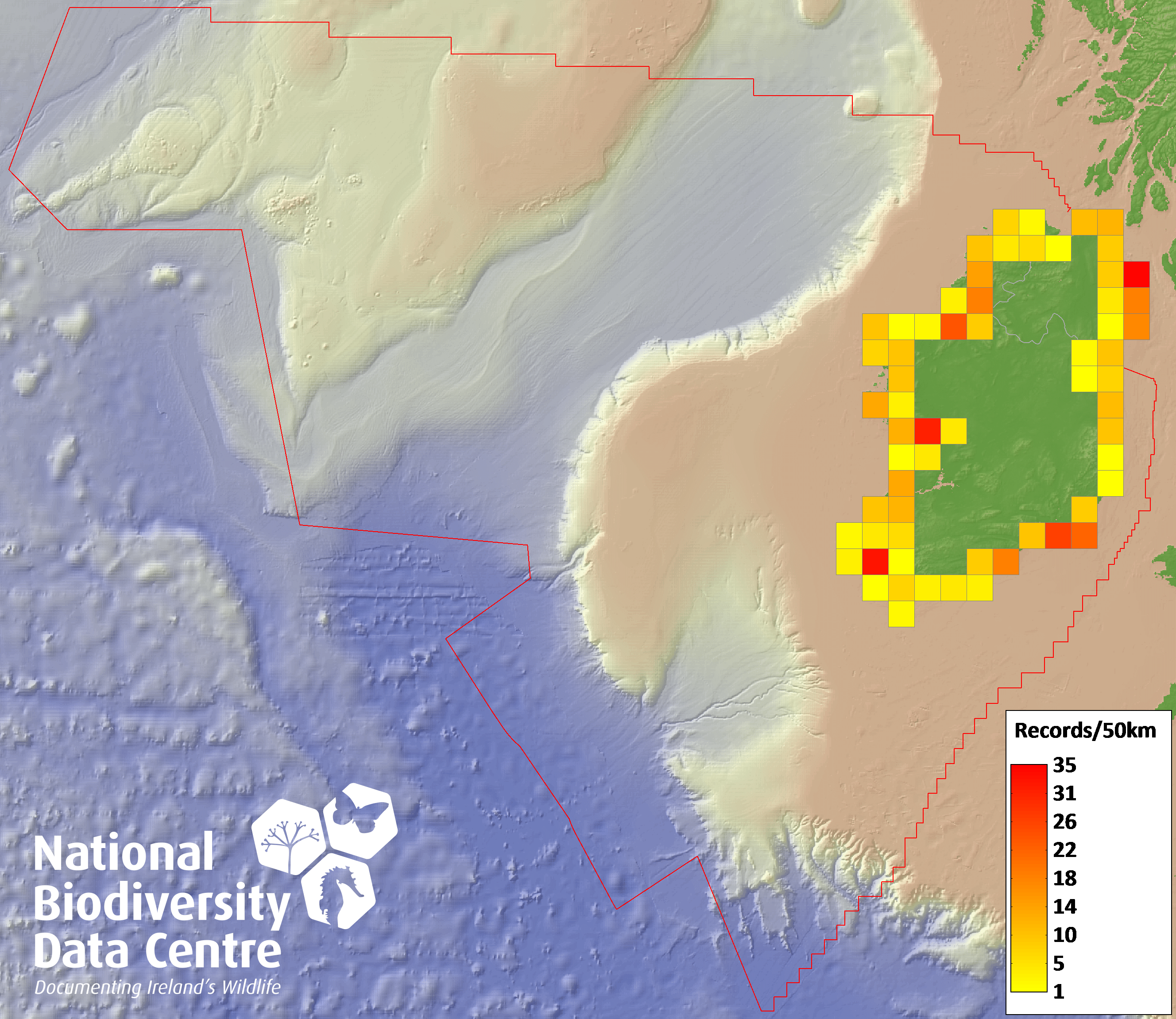 Distribution of the number of records recorded within each 10km grid square (ITM).Marine Map - 50km