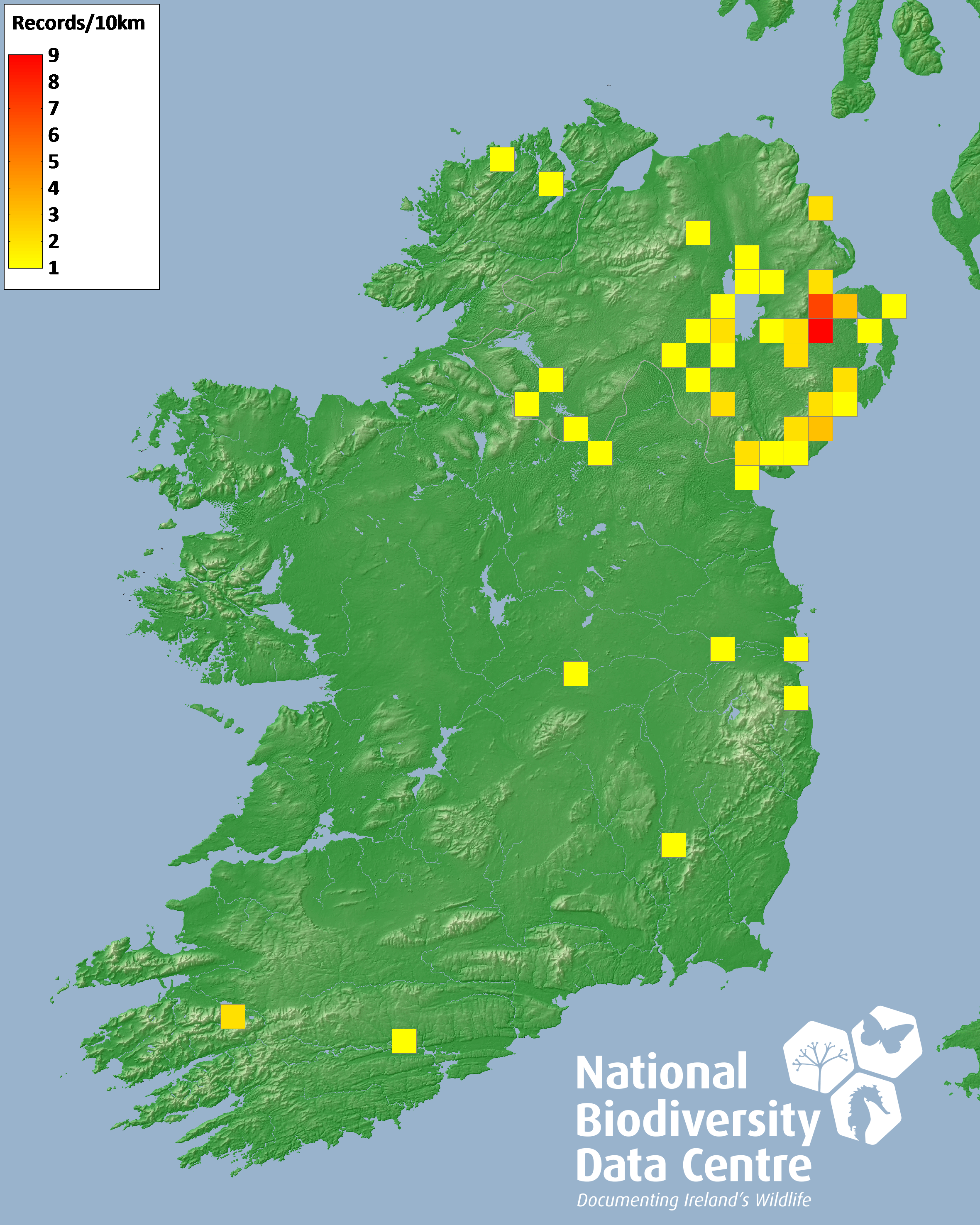 Distribution of the number of records recorded within each 10km grid square (ITM).Marine Map - 50km
