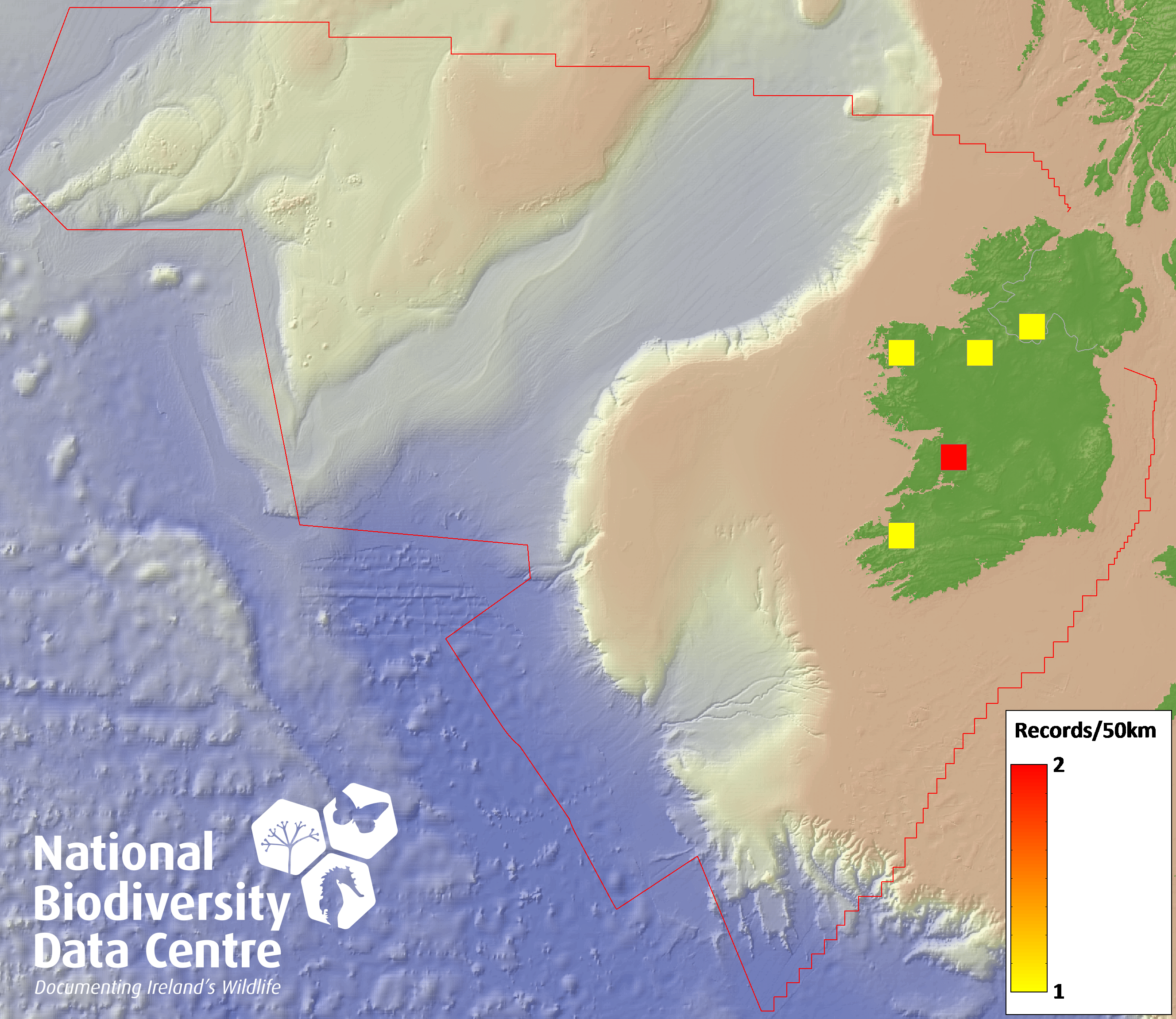 Distribution of the number of records recorded within each 10km grid square (ITM).Marine Map - 50km