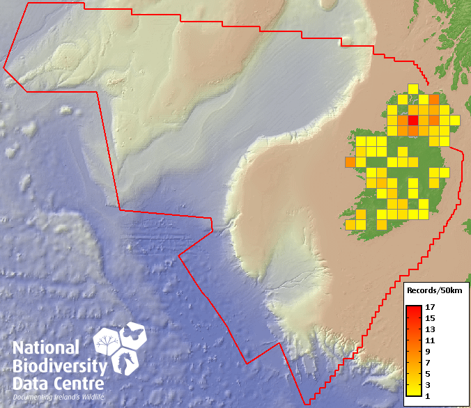 Distribution of the number of records recorded within each 10km grid square (ITM).Marine Map - 50km